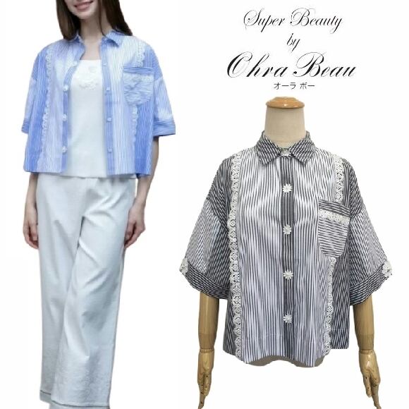 スーパービューティー ブラウス ストライプ柄 ショート 2515010 ブラック 2025年春夏 オーラボー 大人かわいい服 大人スタイル キレイメ Super Beauty レディース アパレル 女性 M L LL 30代 40代 50代 60代