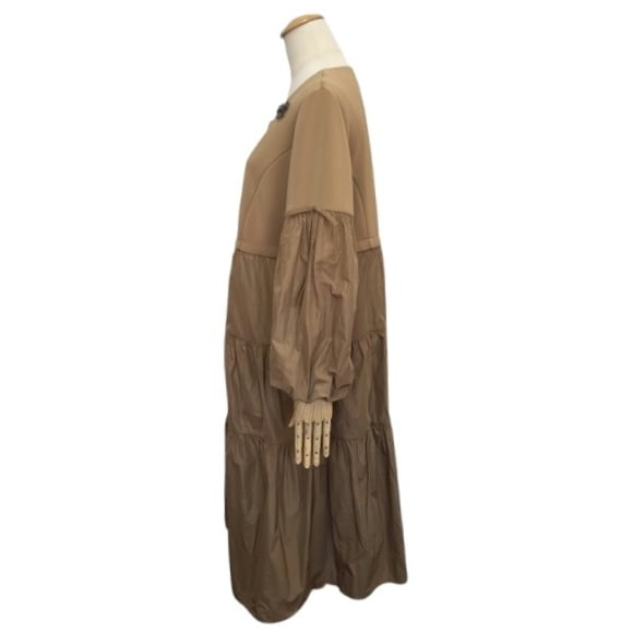 タフタ素材で袖、ティアードデザインが