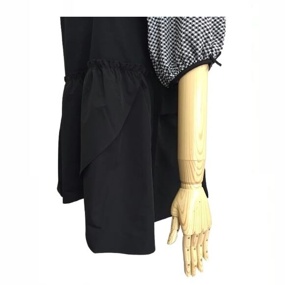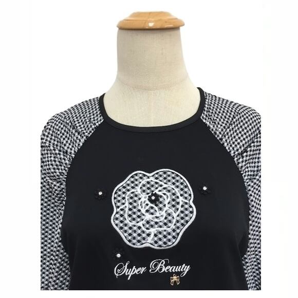 スーパービューティー チュニック カットソー 袖ギンガムチェック 胸元花デザイン 2512009 ブラック 2025年春夏 オーラボー 大人かわいい服 大人スタイル キレイメ Super Beauty レディース アパレル 女性 M L LL 30代 40代 50代 60代