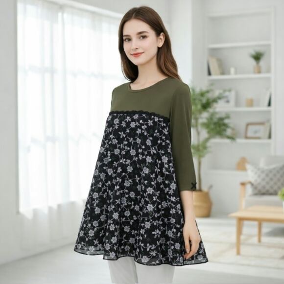 胸元チュール切替の七分袖チュニックです。