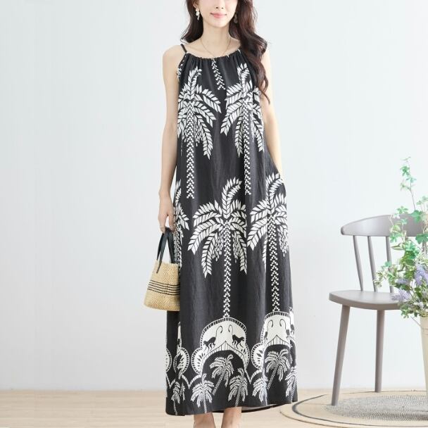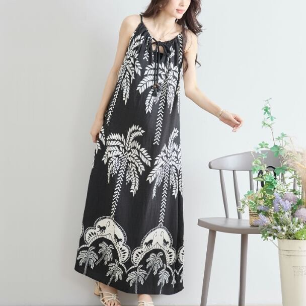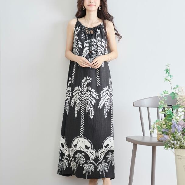 マキシワンピース リゾートモチーフ ギャザー N82-388 amie studio M L フリー 大人可愛い ミセス fmsd キレイメ 普段着 おしゃれ着 デイリーファッション 大人スタイル 婦人服 可愛い服 30代 40代 50代 60代 洋服 レディース