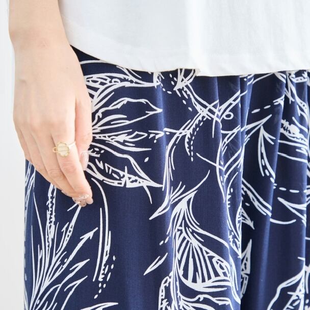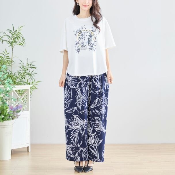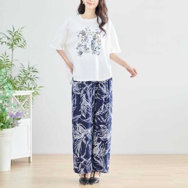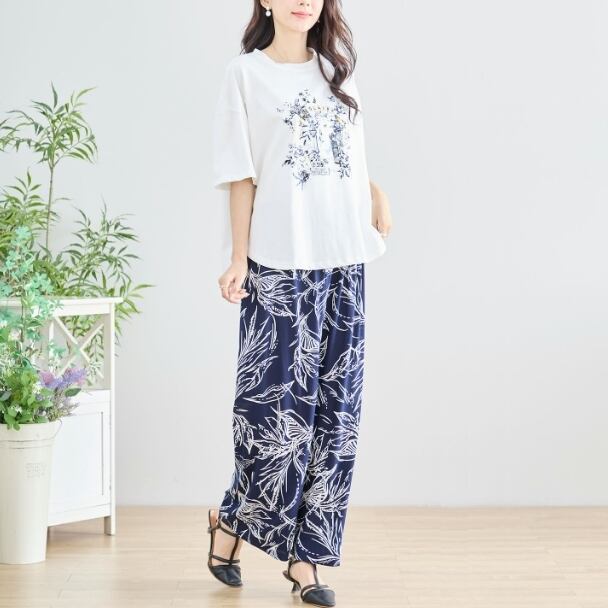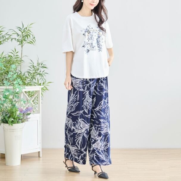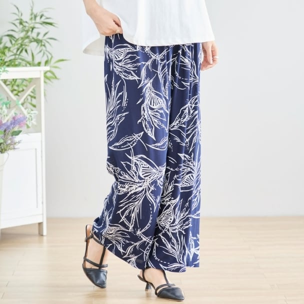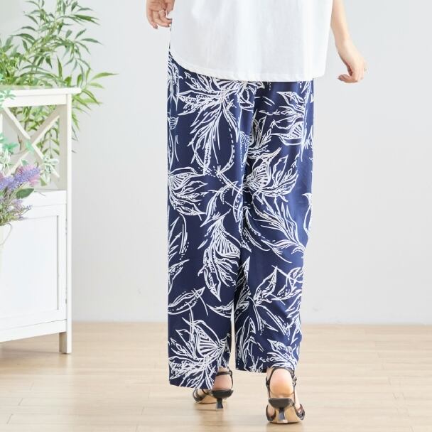 イージーパンツ リーフライン柄 リラックス ワイドパンツ N53-035 TRUBE M L フリー サラサラ 涼しい 大人可愛い ミセス fmsd キレイメ 普段着 おしゃれ着 デイリーファッション 大人スタイル 婦人服 可愛い服 30代 40代 50代 60代 洋服 レディース