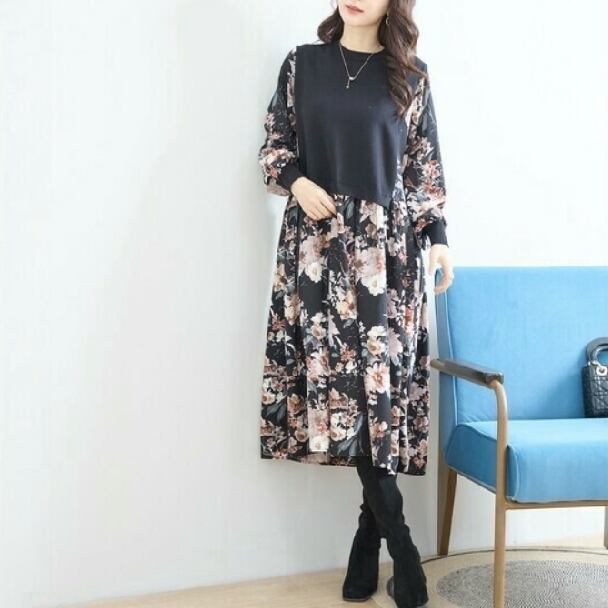 ワンピース 異素材 ドッキング花柄 N83-005 TRUBE L LL フリー 大人可愛い ミセス fmsd キレイメ 普段着 おしゃれ着 デイリーファッション 大人スタイル 婦人服 可愛い服 30代 40代 50代 60代 洋服 レディース