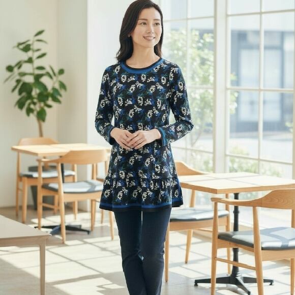 スーパービューティー チュニック カットソー フラワープリント切替 2522004 ブラック 2025年秋冬 オーラボー 大人かわいい服 大人スタイル キレイメ Super Beauty レディース アパレル 女性 M L LL 30代 40代 50代 60代