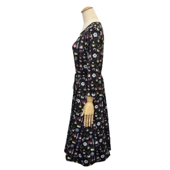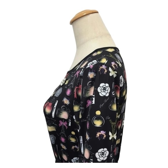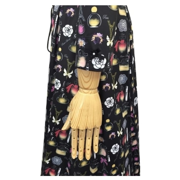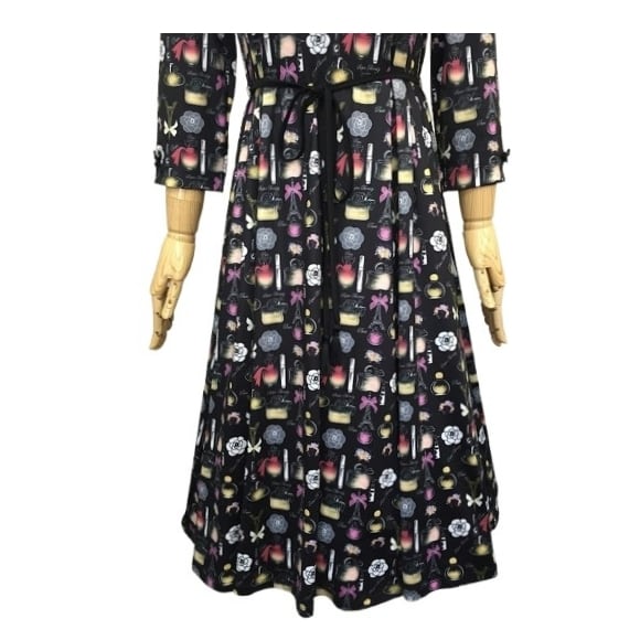 香水瓶、ばら、エッフェル塔柄のワンピースです。