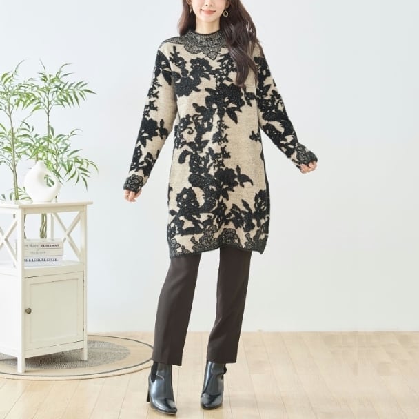 フラワーレース柄が特徴的なニットワンピース。