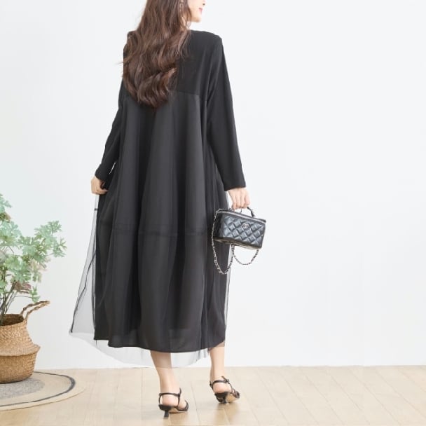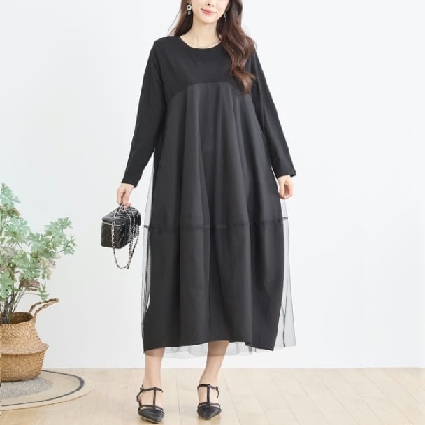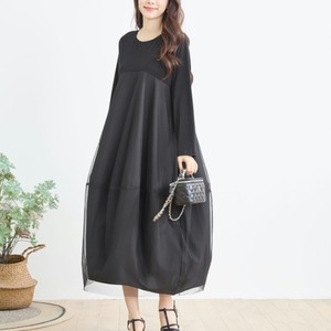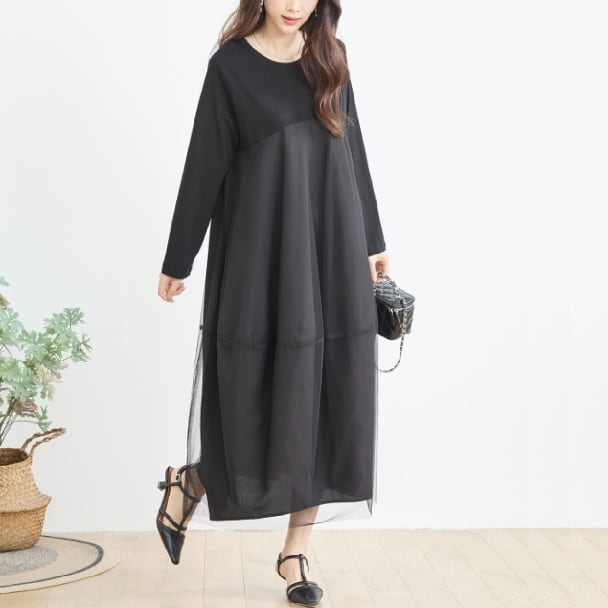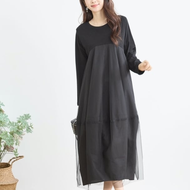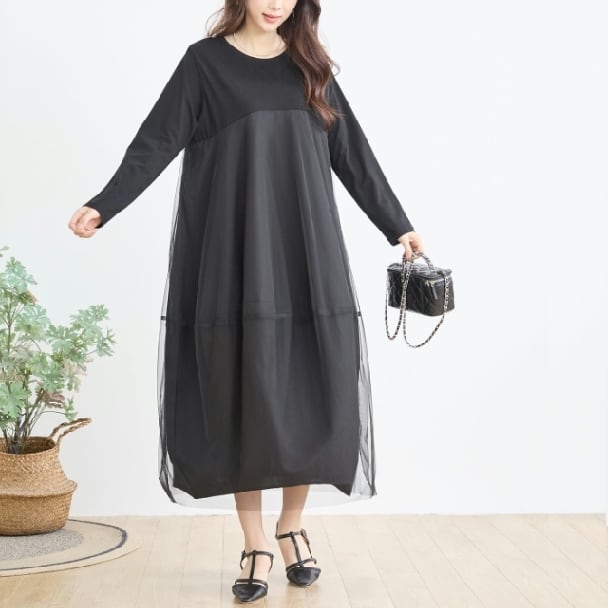 ワンピース チュールドッキング N83-003 TRUBE L LL 体型カバー ゆったり 上品 きれいめ 長袖 ミセス ファッション大人可愛い ミセス fmsd 大人スタイル 婦人服 可愛い服 30代 40代 50代 60代 洋服 レディース