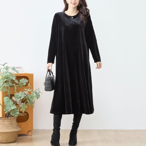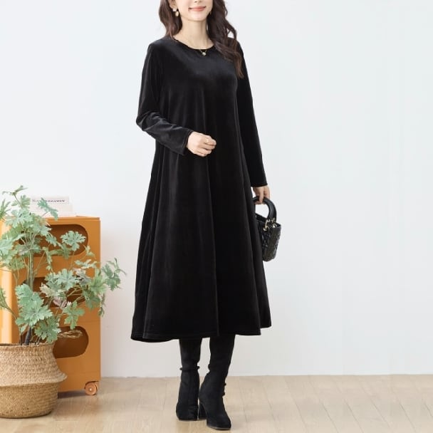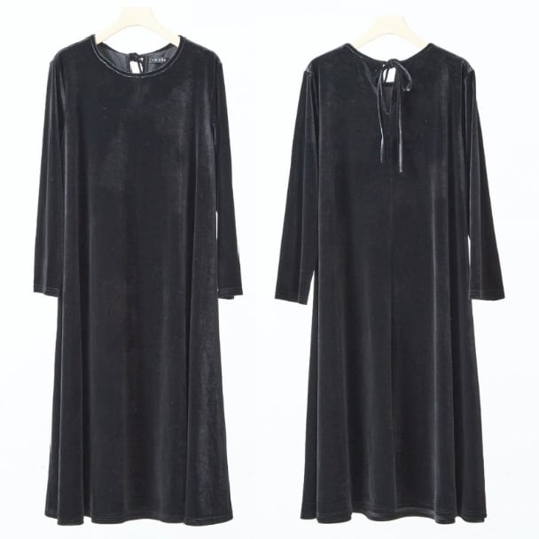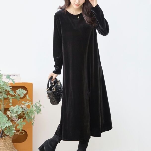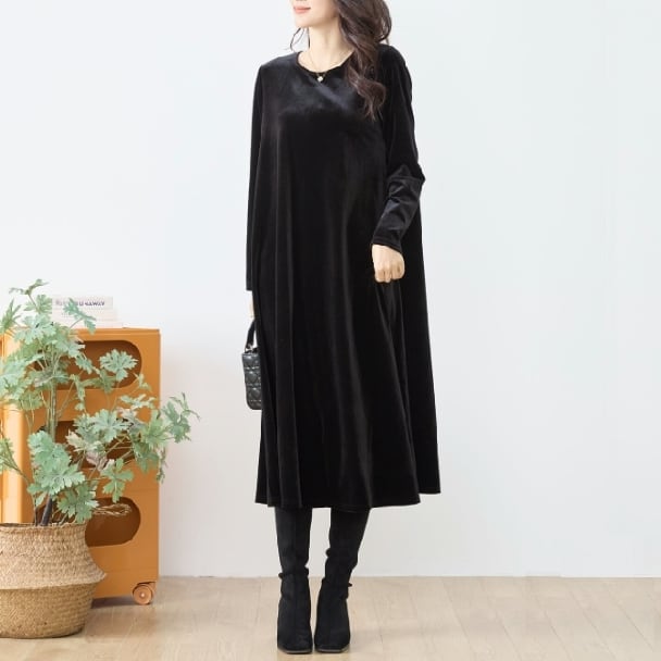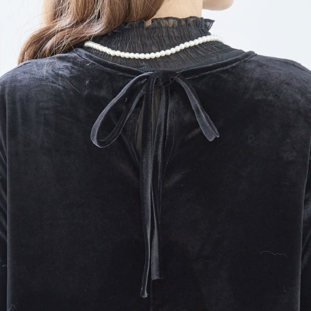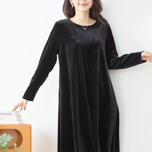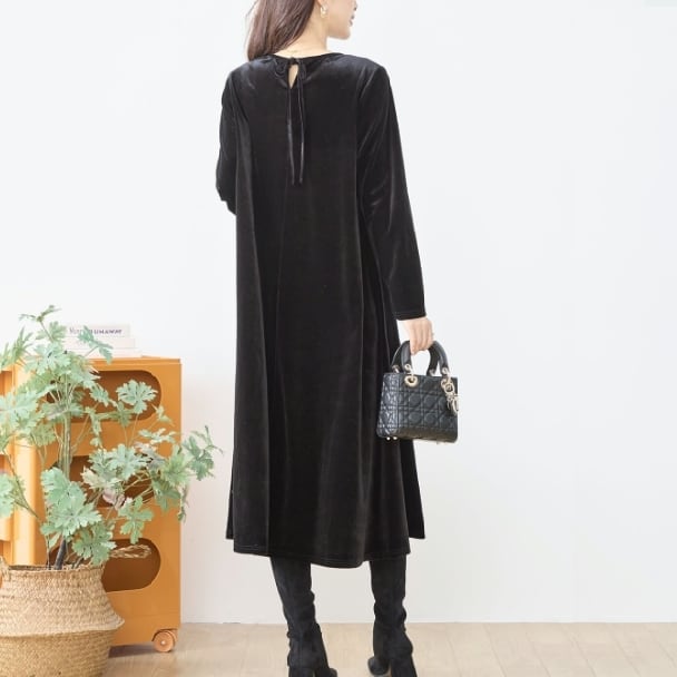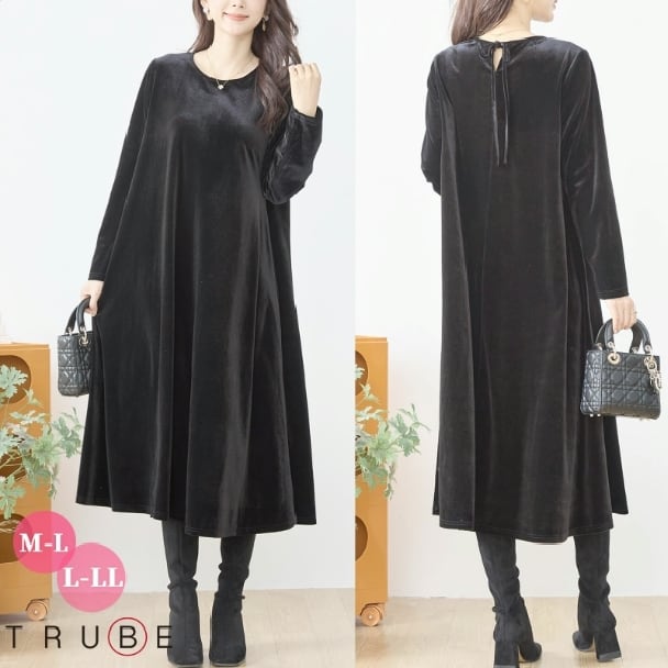 TRUBE ベロア ワンピース ミセス 40代 50代 上品 N83-041 N83-042 M L LL 光沢 膝下丈 ロング 長袖 バックリボン ブラック エレガント フォーマル 体型カバー 秋冬 fmsd 大人可愛い服