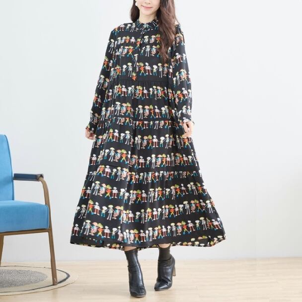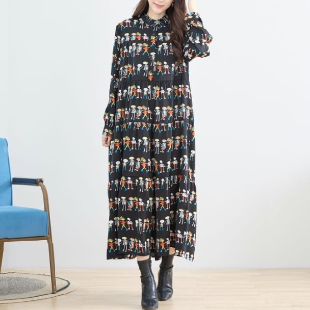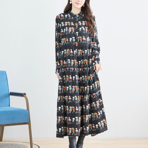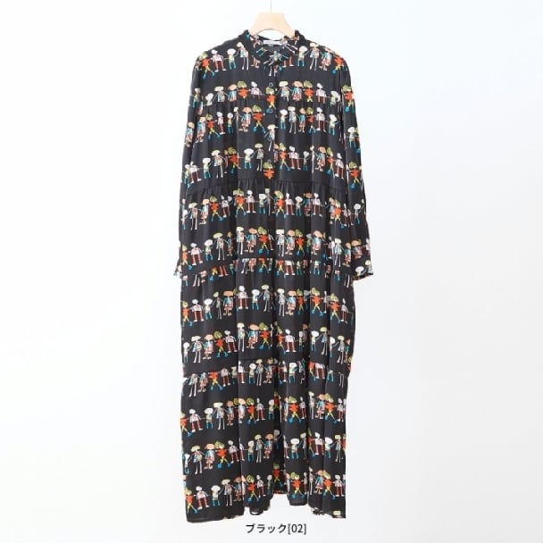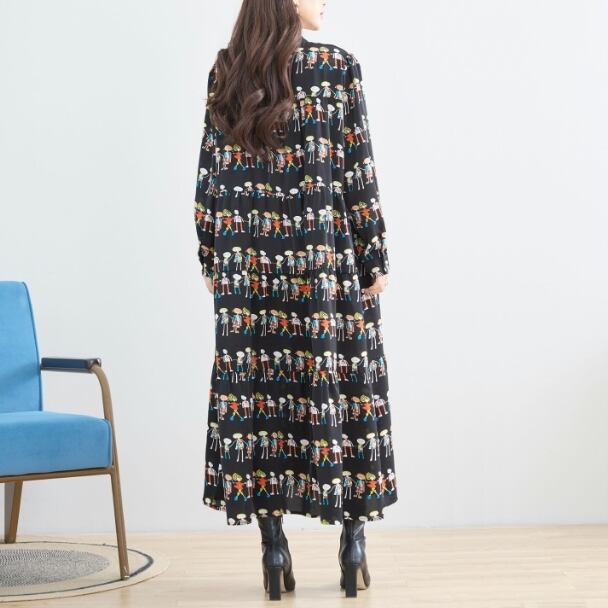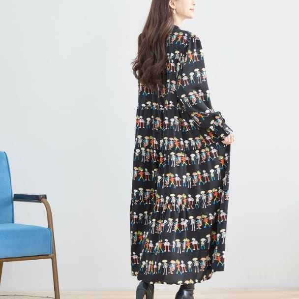 【reve bleu】フィギュア柄 デザインワンピース ロングワンピース ティヤード 前開き 長袖 総柄 個性派 大人可愛い ミセス レディース C38-941 fmsd デイリーファッション 普段着