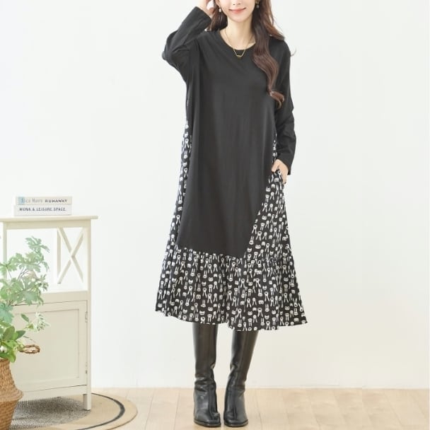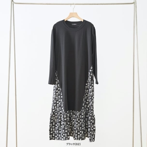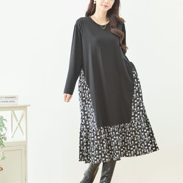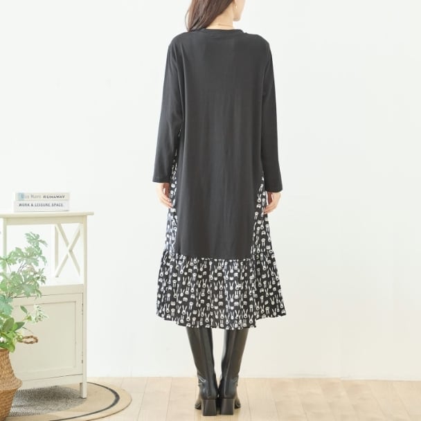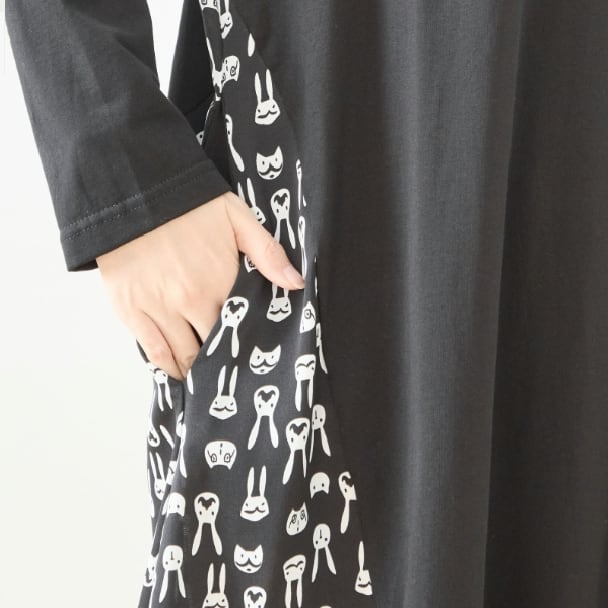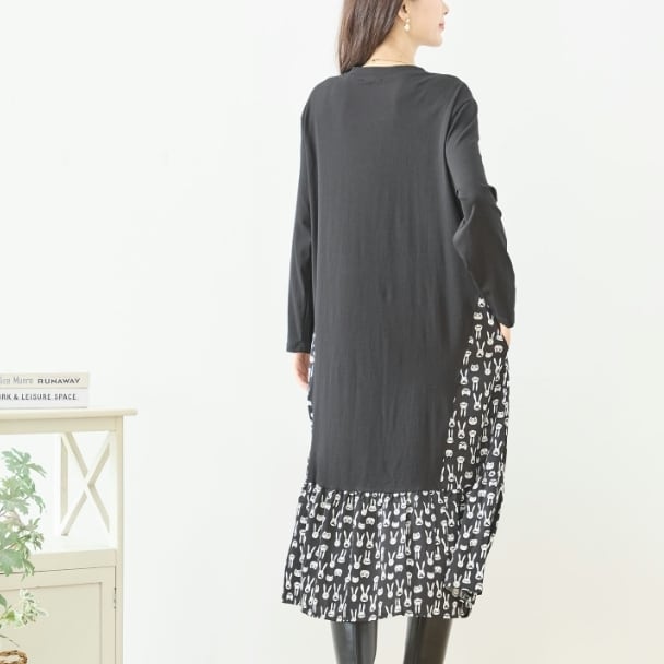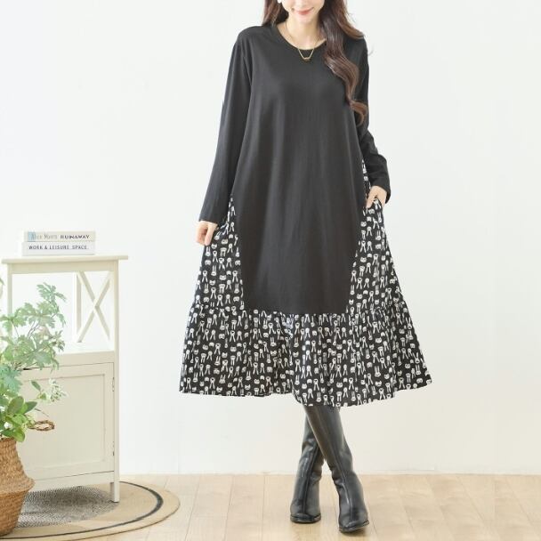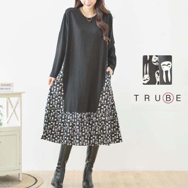 TRUBE 異素材切替 ロングワンピース レディース 大人可愛い 総柄 切替 ラビット柄 ブラック 長袖 ポケット付き ミセス きれいめ N82-466 fmsd レディース 長袖 デイリーファッション 大人フェミニン 大人可愛い 普段着 ミセス おしゃれ着 30代 40代 50代 60代