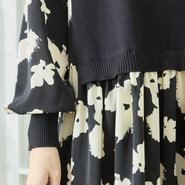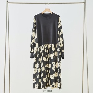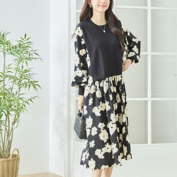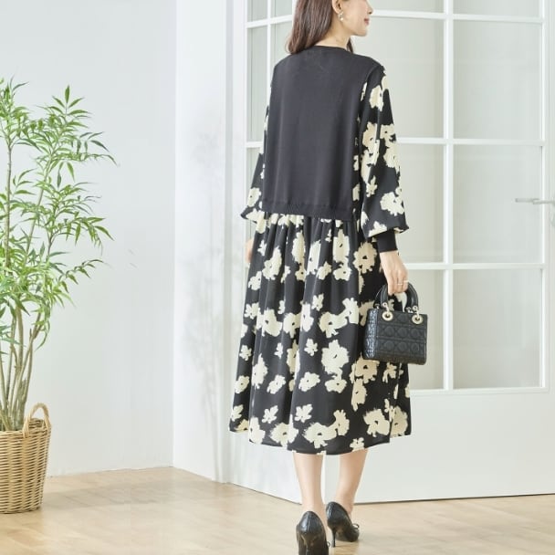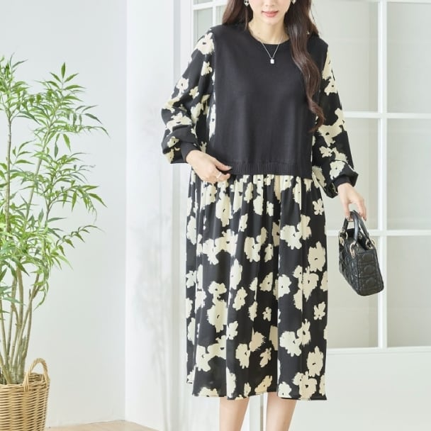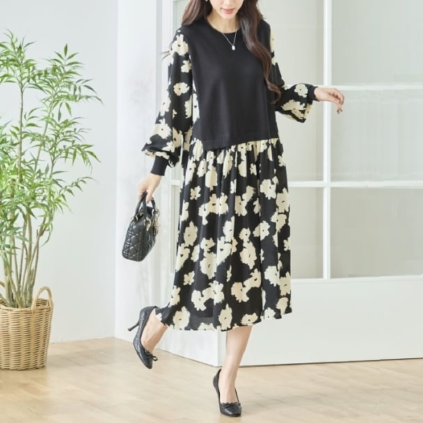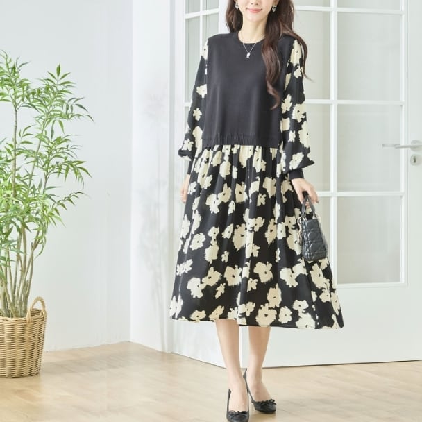 TRUBE 異素材 切替 フラワープリント ワンピース レディース ニット切替 花柄 長袖 きれいめ ミセス 大人可愛い N83-248 fmsd レディース 長袖 デイリーファッション 大人フェミニン 大人可愛い 普段着 ミセス おしゃれ着 30代 40代 50代 60代