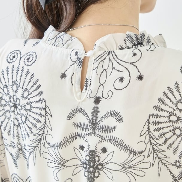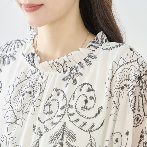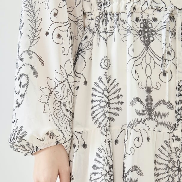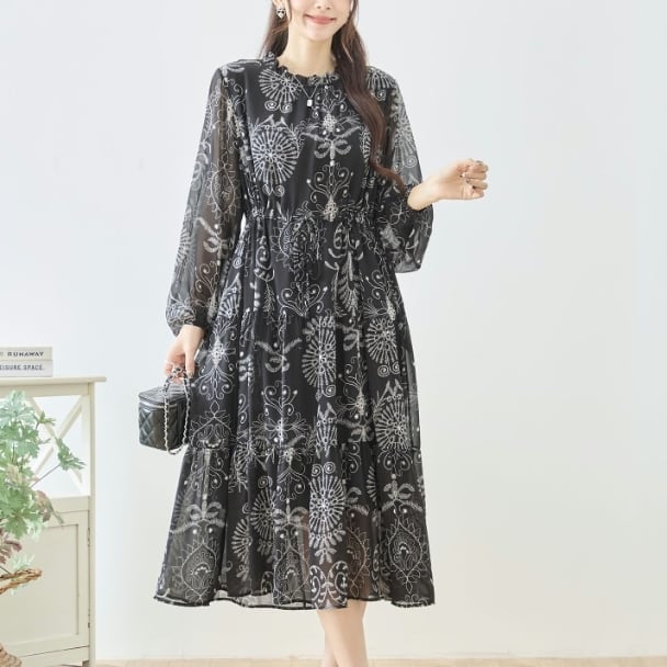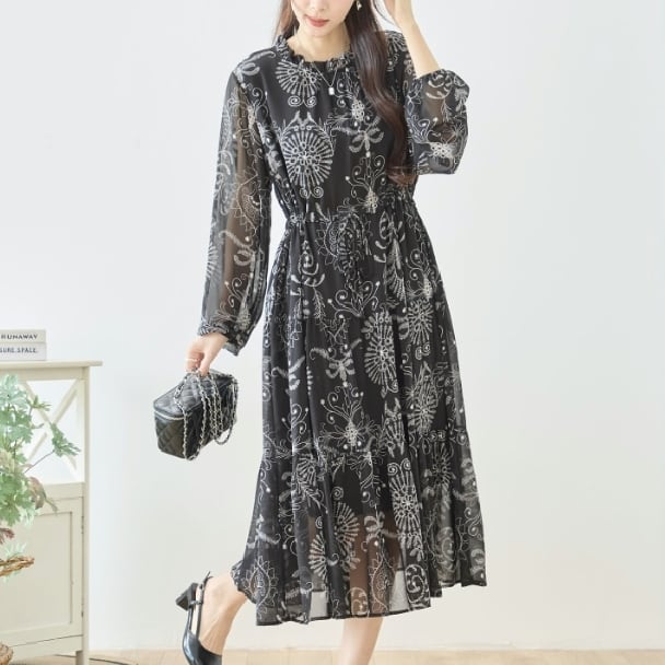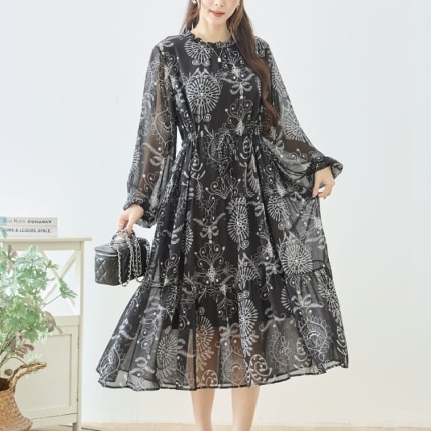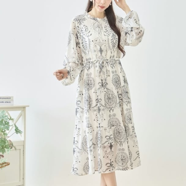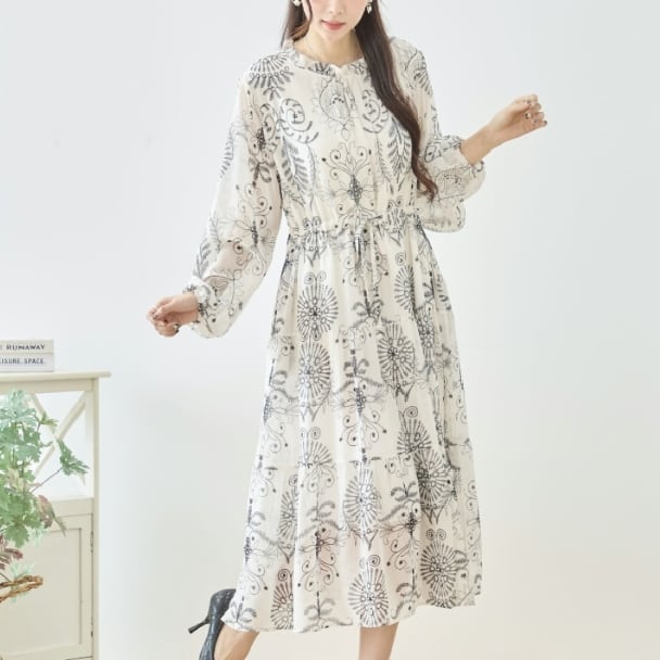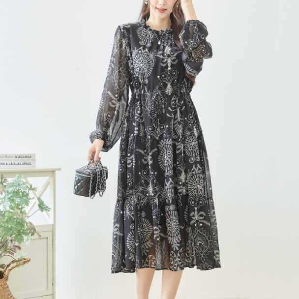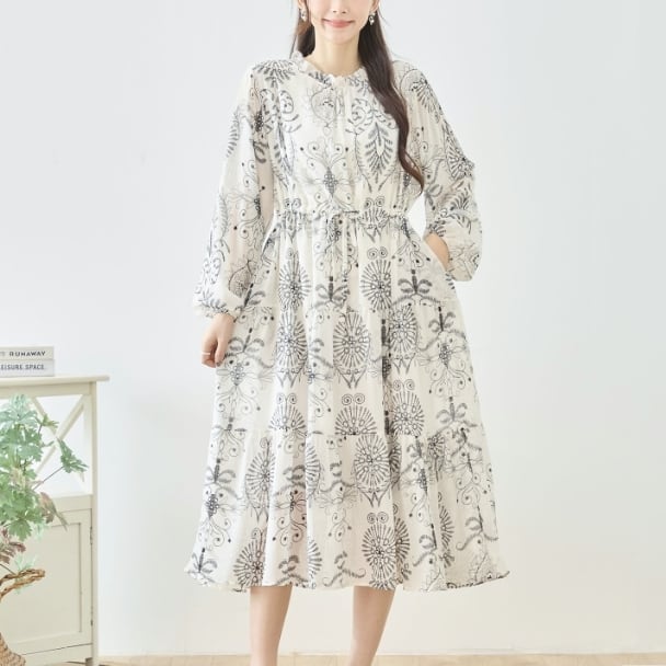 TRUBE エスニック調 プリントロングワンピース N82-454 fmsd アイボリー ブラック レディース 長袖 デイリーファッション 大人フェミニン 大人可愛い 普段着 ミセス おしゃれ着 30代 40代 50代 60代