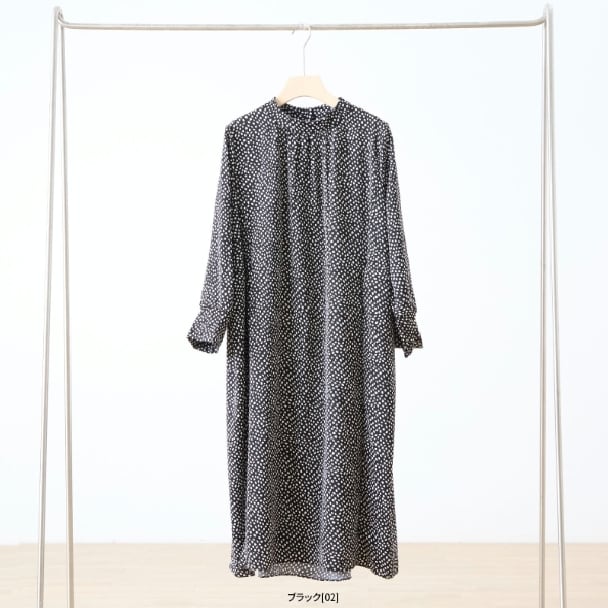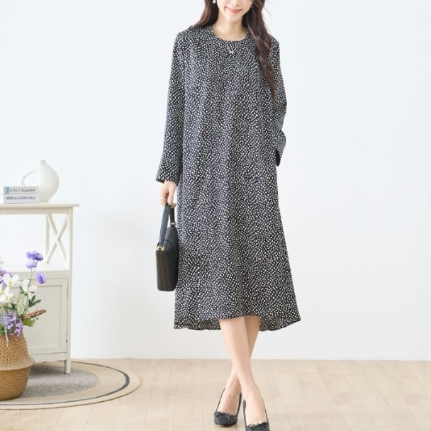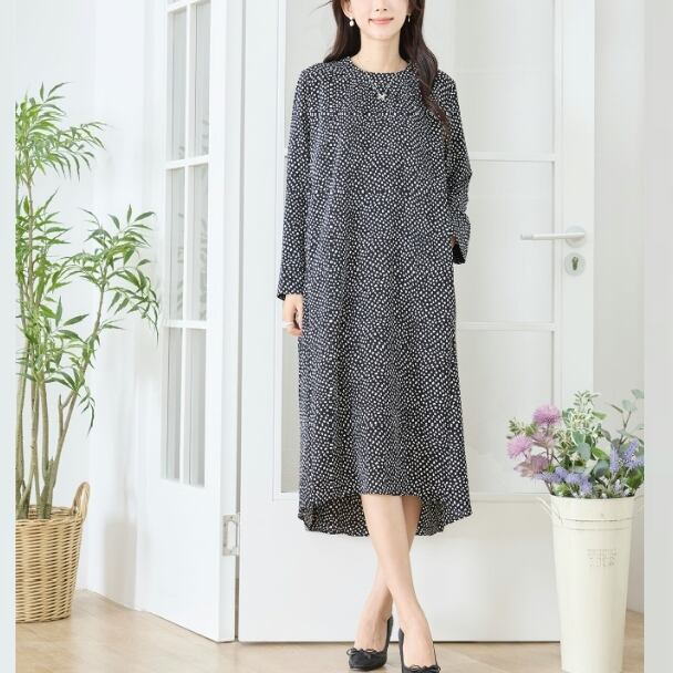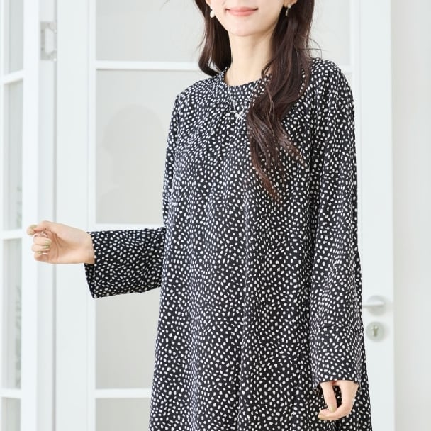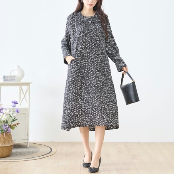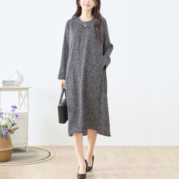 TRUBE 変形ドット柄 タックデザイン ロングワンピース 両サイドポケット付き 大人ナチュラル C38-470 fmsd レディース 長袖 デイリーファッション 大人フェミニン 大人可愛い 普段着 ミセス おしゃれ着