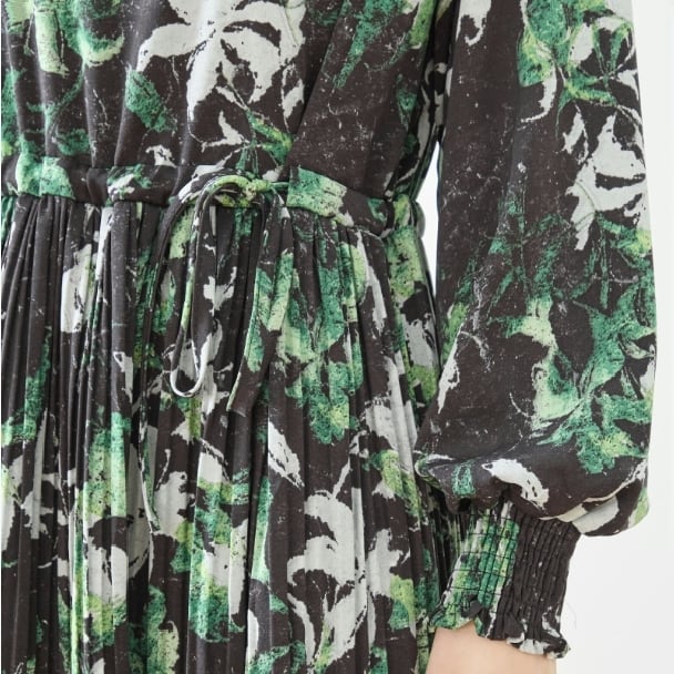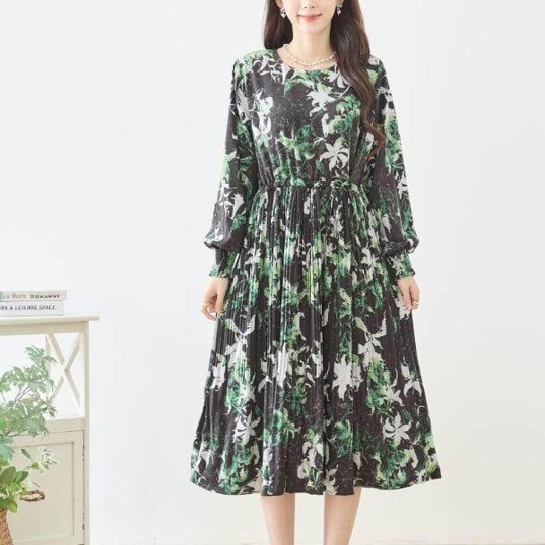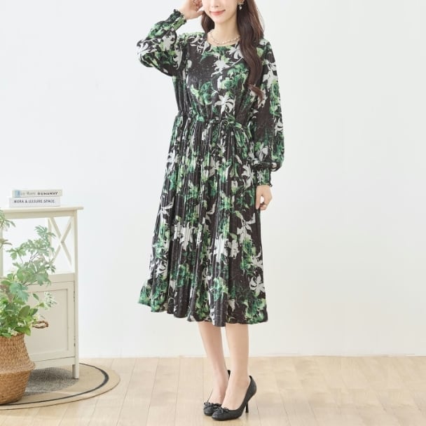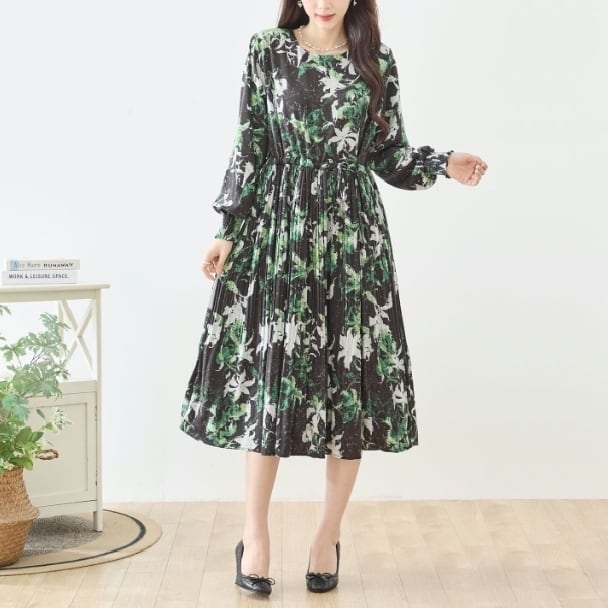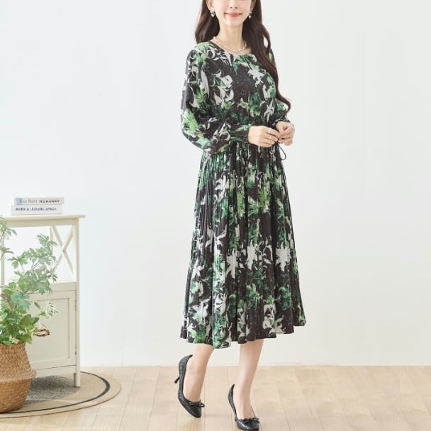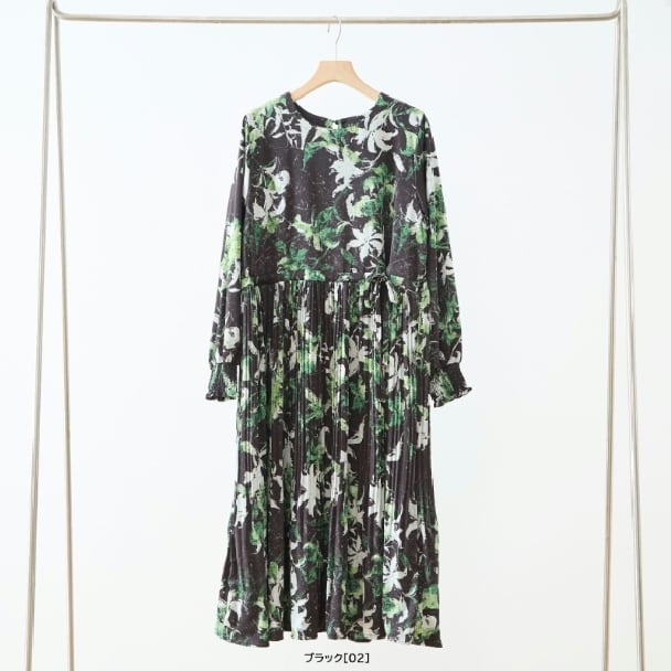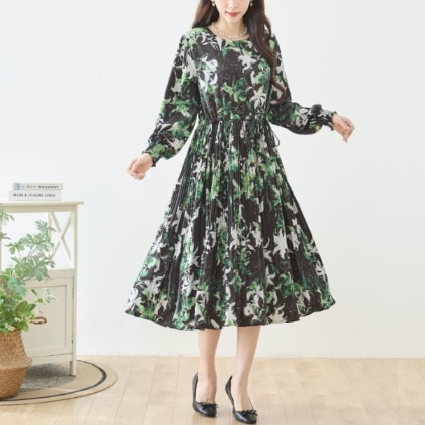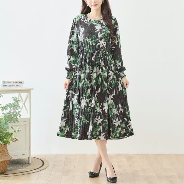 TRUBE ボタニカルプリント ロングワンピース ウエストリボン ギャザー 長袖 大人エレガント N82-476 fmsd レディース 長袖 デイリーファッション 大人可愛い 普段着 ミセス おしゃれ着 30代 40代 50代 60代