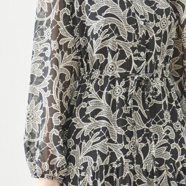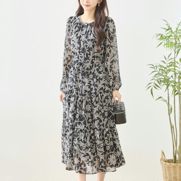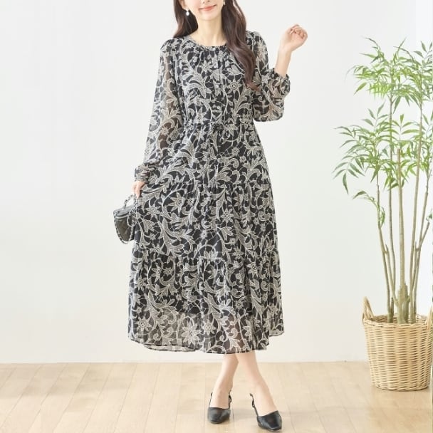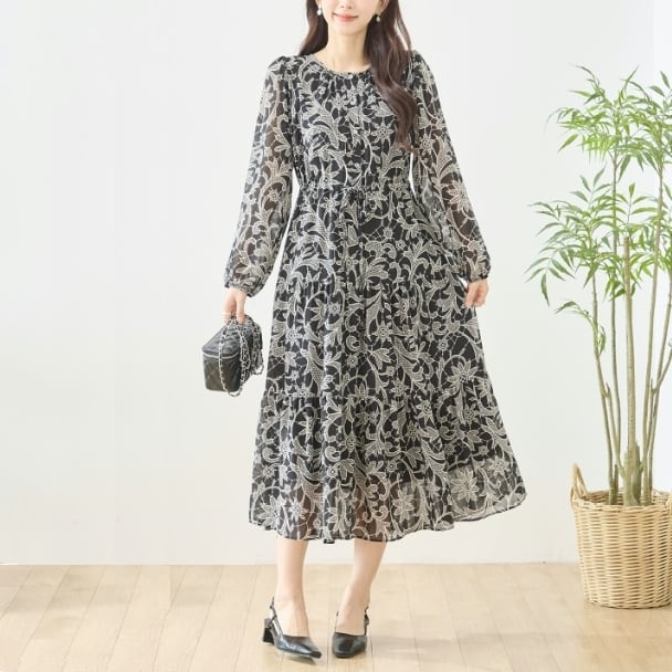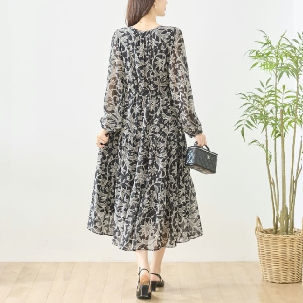 ロングワンピース フラワー ラインタッチ N82-554 TRUBE 大人ナチュラル fmsd レディース 長袖 デイリーファッション 大人フェミニン 大人可愛い 普段着 ミセス おしゃれ着