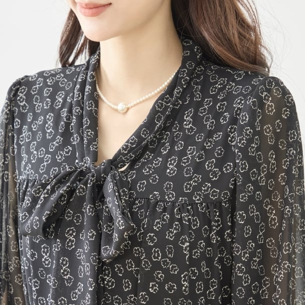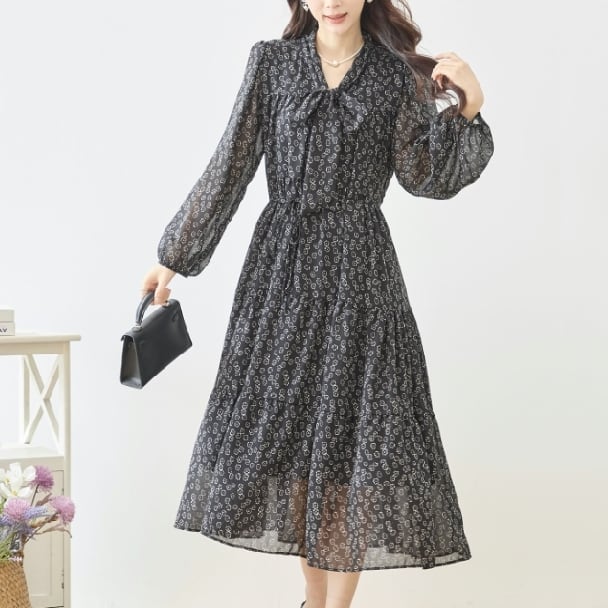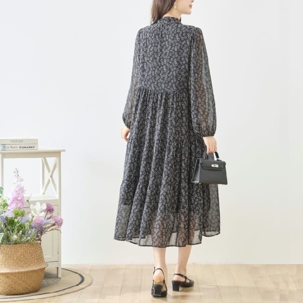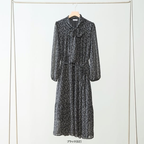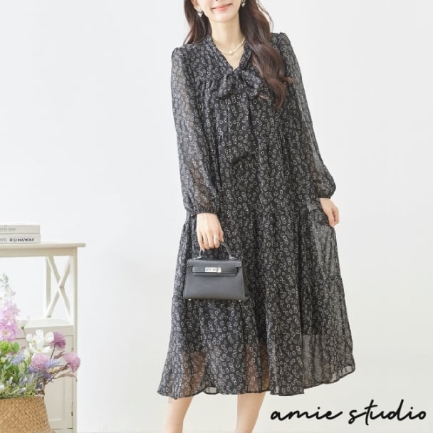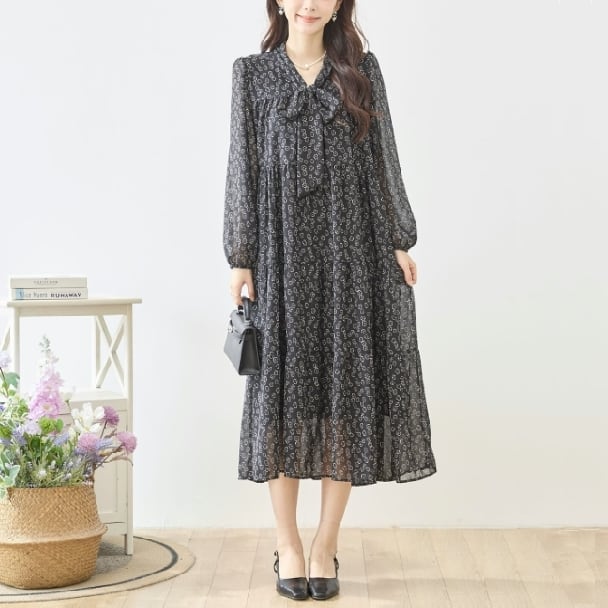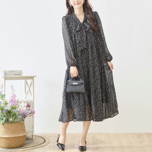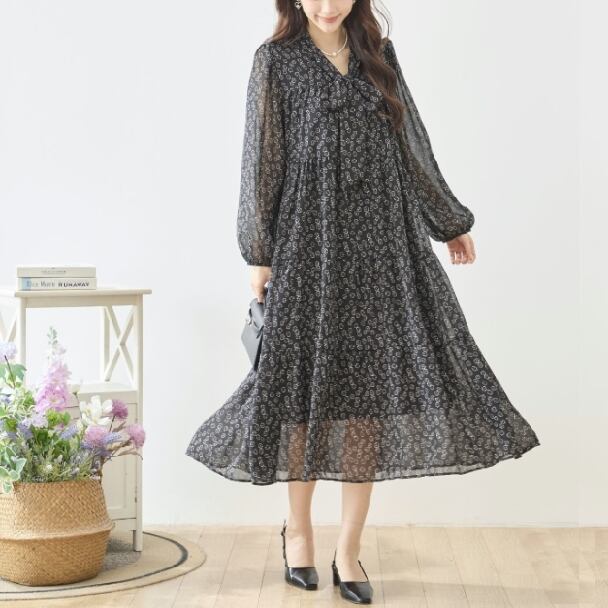 ロングワンピース 小花柄 ボウタイ シフォン N82-596 amie studio 大人ナチュラル fmsd レディース 長袖 デイリーファッション 大人フェミニン 大人可愛い 普段着 ミセス おしゃれ着