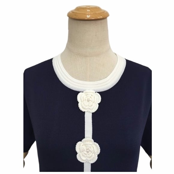 スーパービューティー 配色ニットワンピース かぎ針花モチーフ付き 半袖 フレア ロング丈 2611011 ネイビー 2026年春夏 オーラボー Super Beauty レディース ミセス 大人可愛い