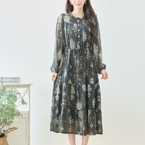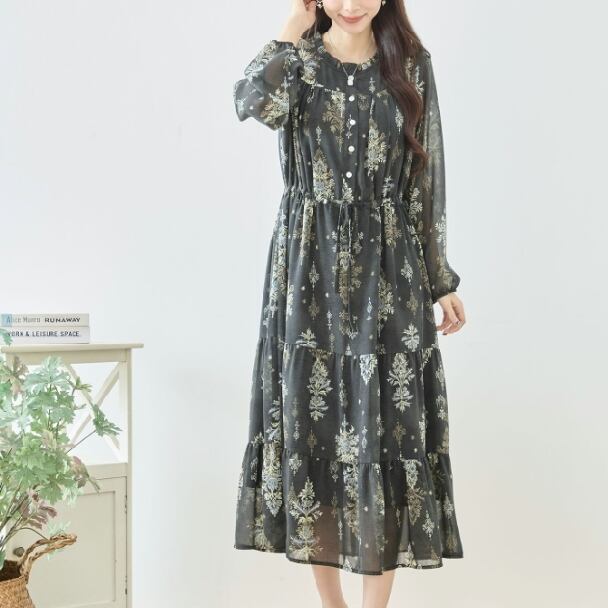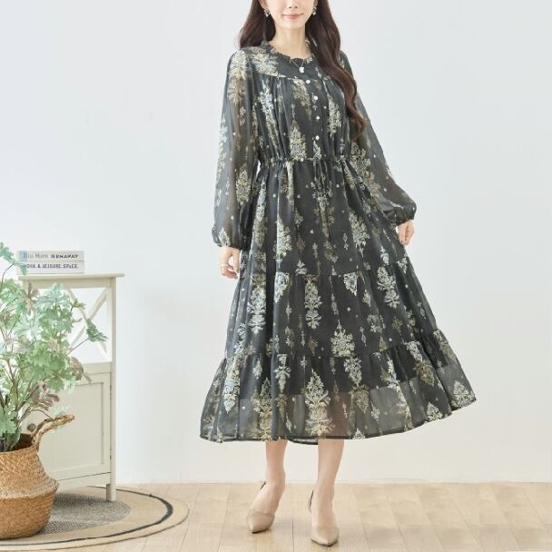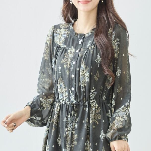 ロングワンピース アンティークフラワープリントシアー N82-455 TRUBE 大人ナチュラル fmsd レディース 長袖 大人フェミニン 大人可愛い 普段着 ミセス おしゃれ着