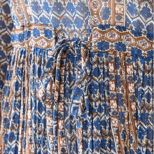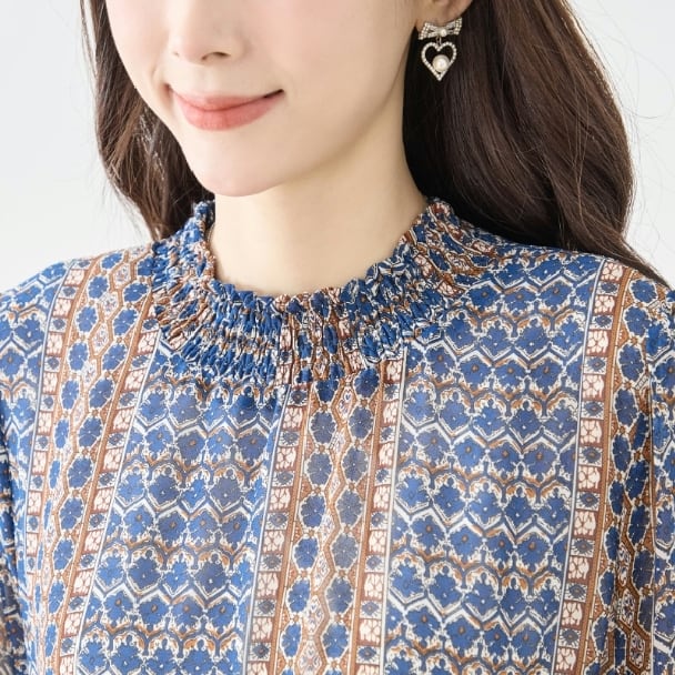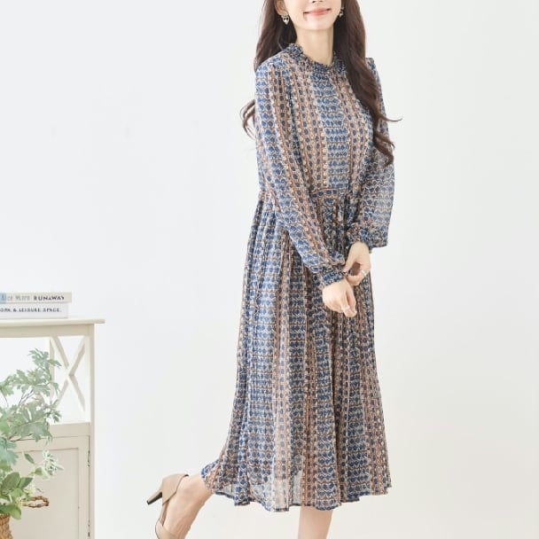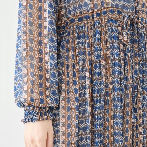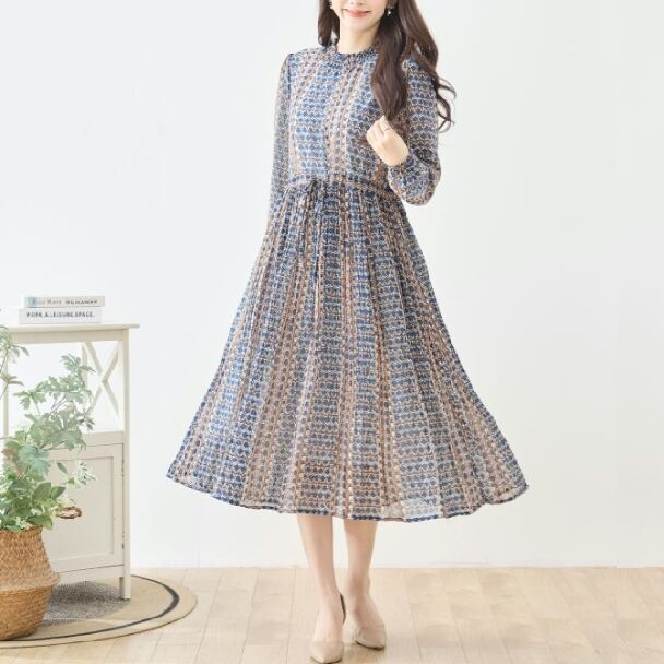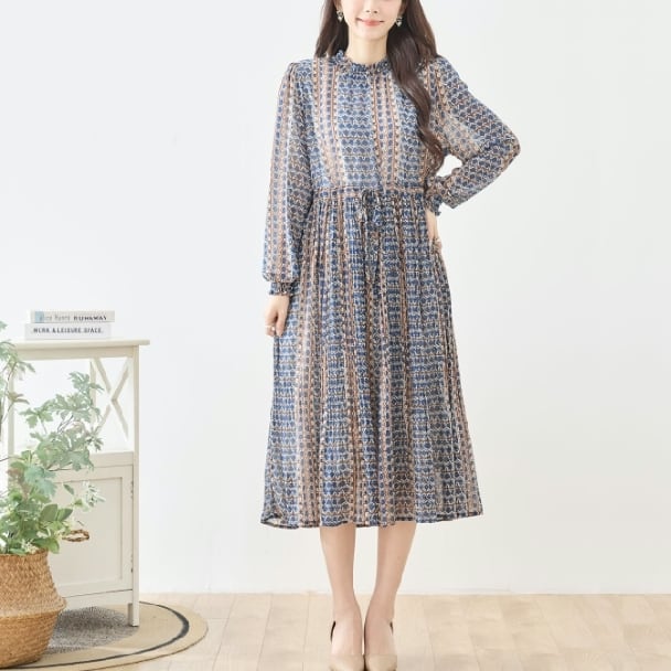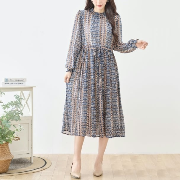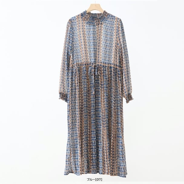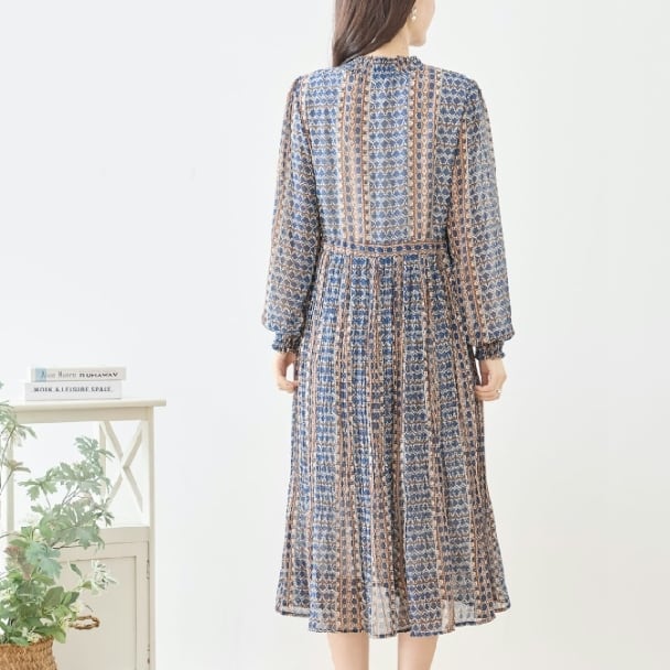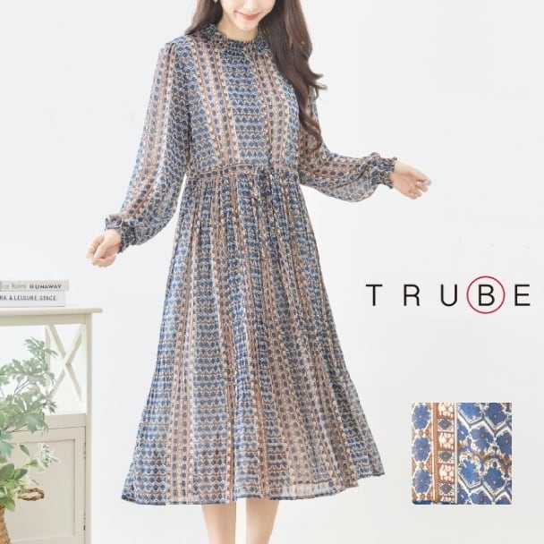 ロングワンピース 幾何柄 シャーリング N82-472 TRUBE 大人ナチュラル fmsd レディース 長袖 大人フェミニン 大人可愛い 普段着 ミセス おしゃれ着