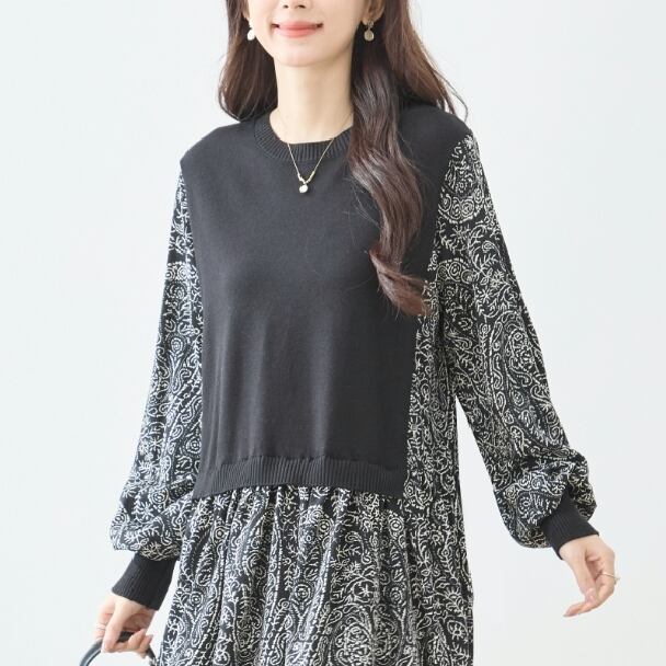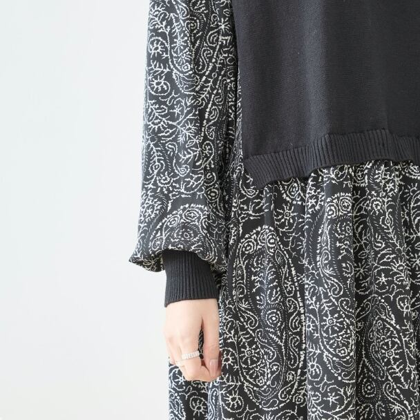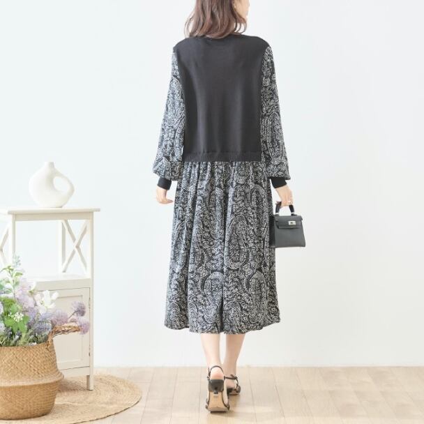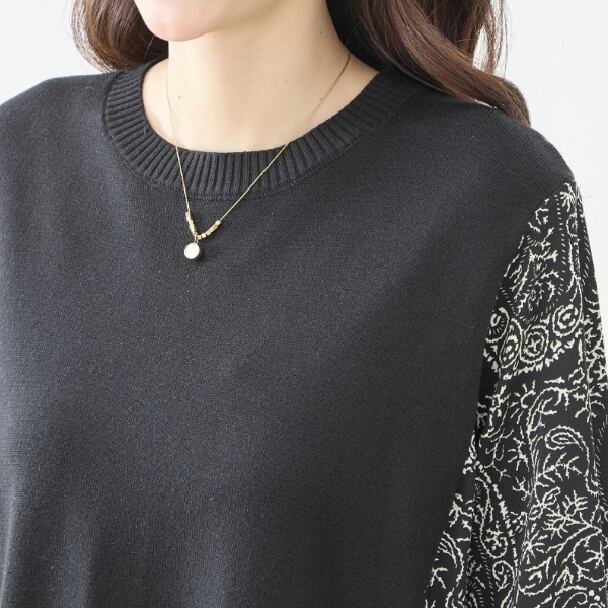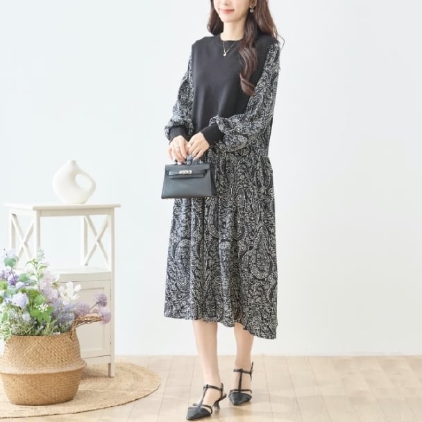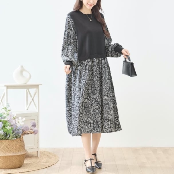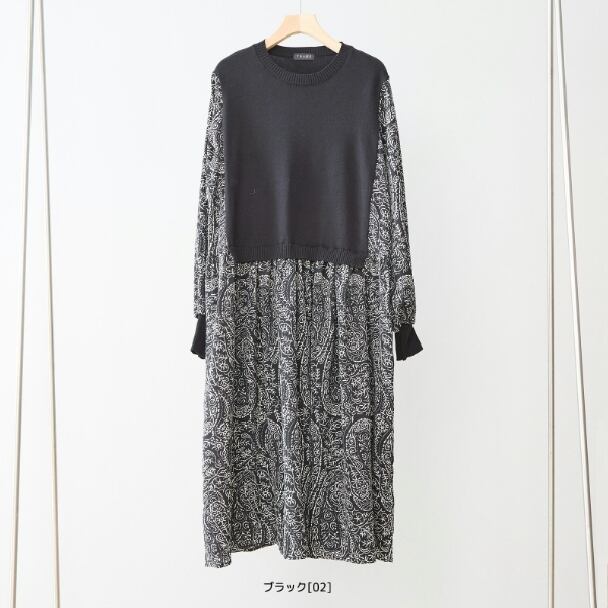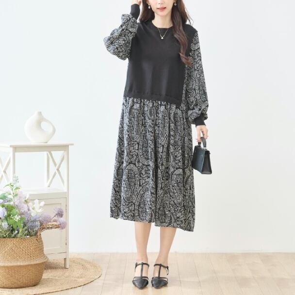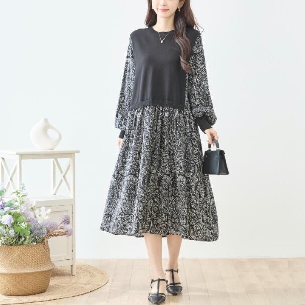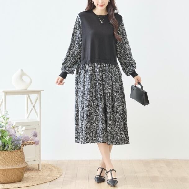 ワンピース 異素材切替 ペイズリー ニット切替 N83-272 TRUBE Aライン ゆったり 体型カバー fmsd レディース 長袖 大人フェミニン 大人可愛い 普段着 ミセスェミニン 大人可愛い 普段着 ミセス