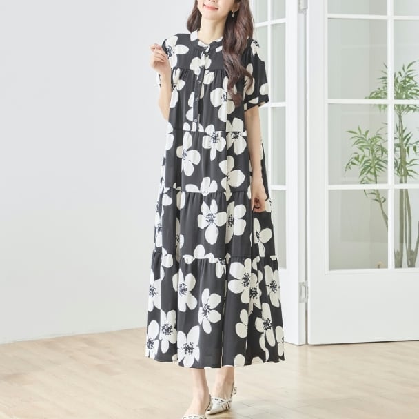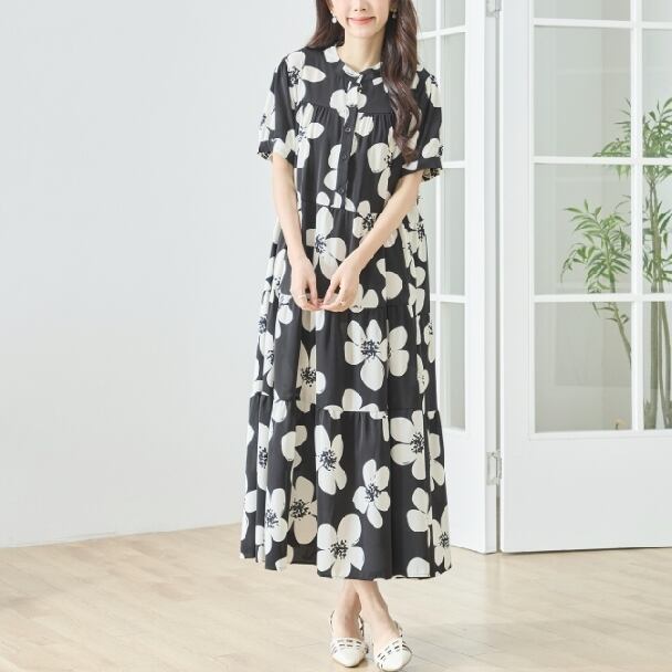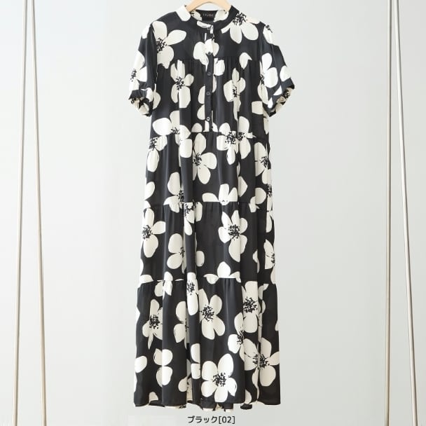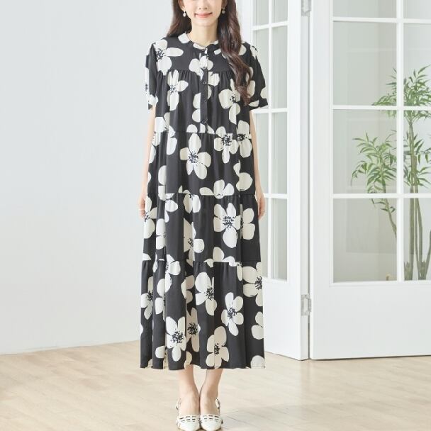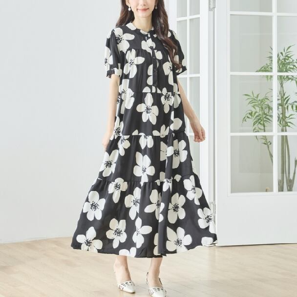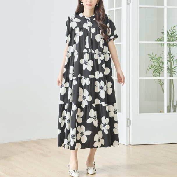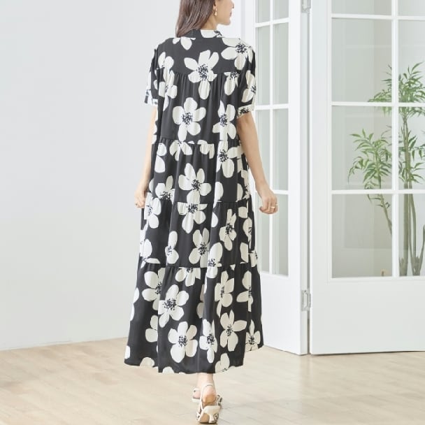 ティアードワンピース モノトーン フラワー N82-511 TRUBE M L Aライン ゆったり 体型カバー 大人ナチュラル fmsd レディース 長袖 大人フェミニン 大人可愛い