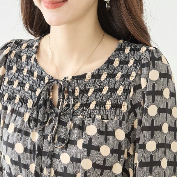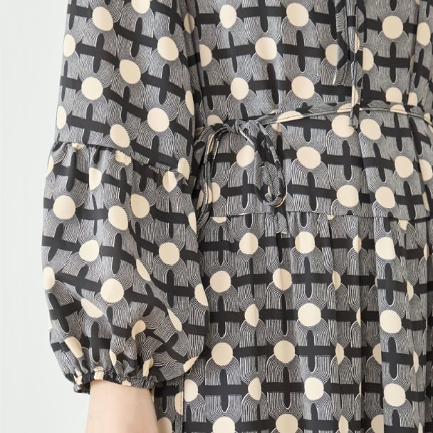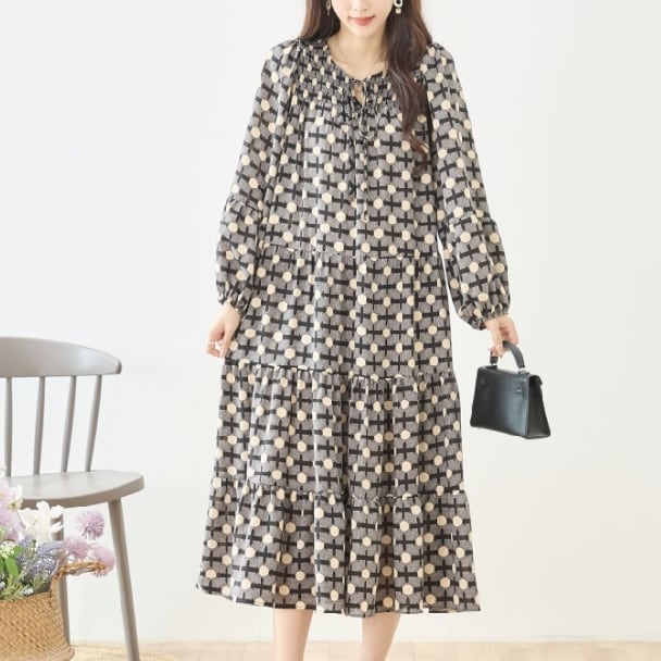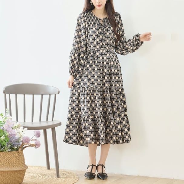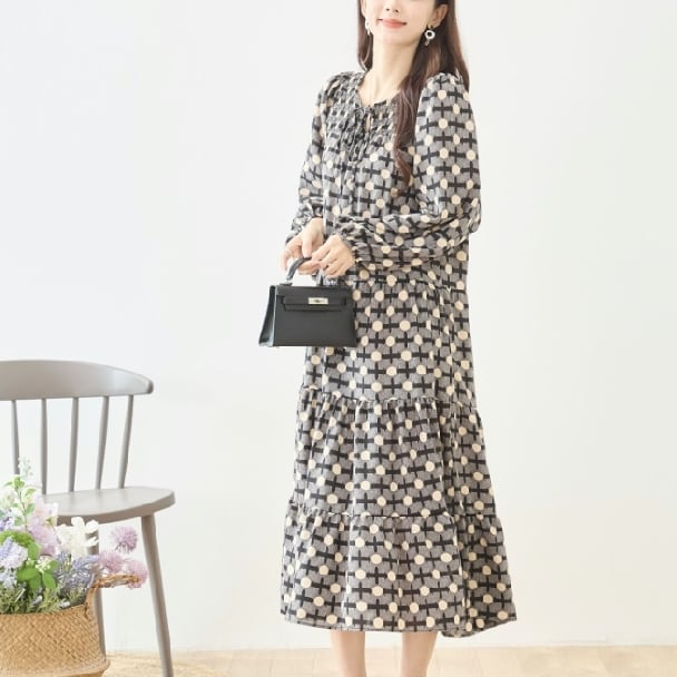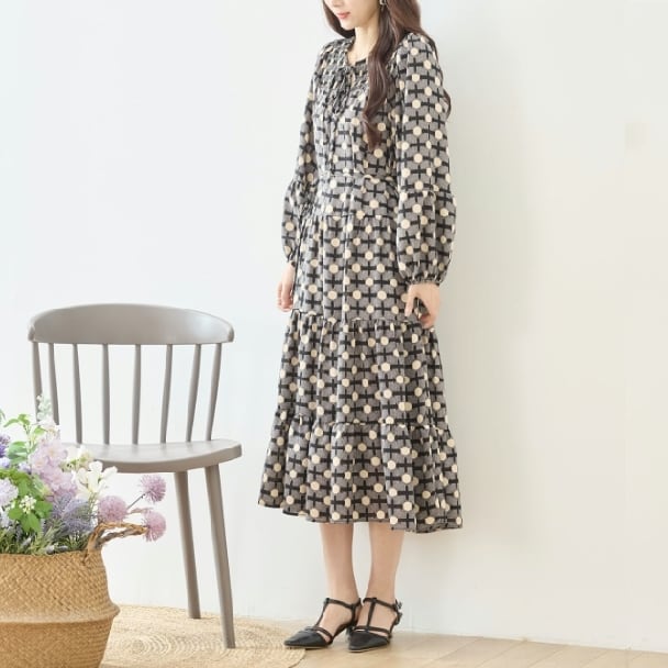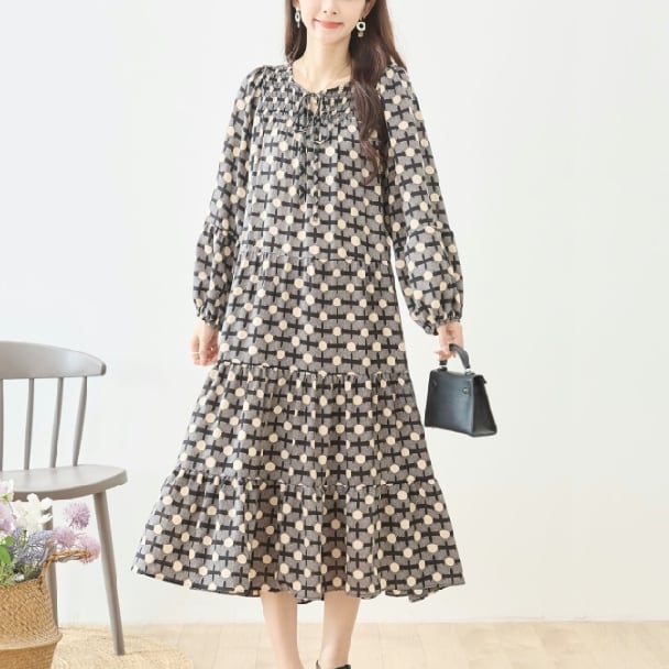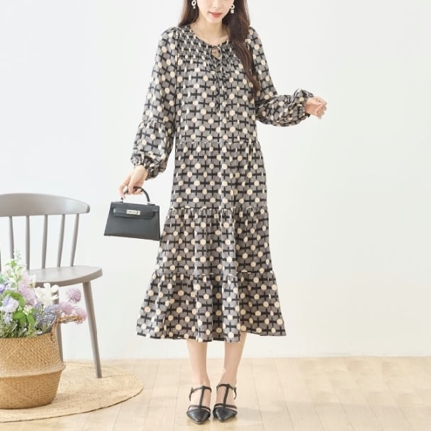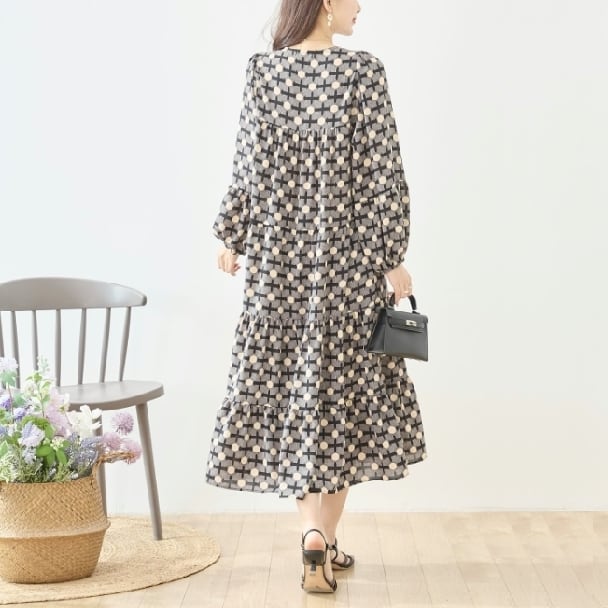 ティアードワンピース 幾何学クロス柄 ロングワンピ N82-604 TRUBE M L Aライン ゆったり 体型カバー 大人ナチュラル fmsd レディース 長袖 大人フェミニン 大人可愛い