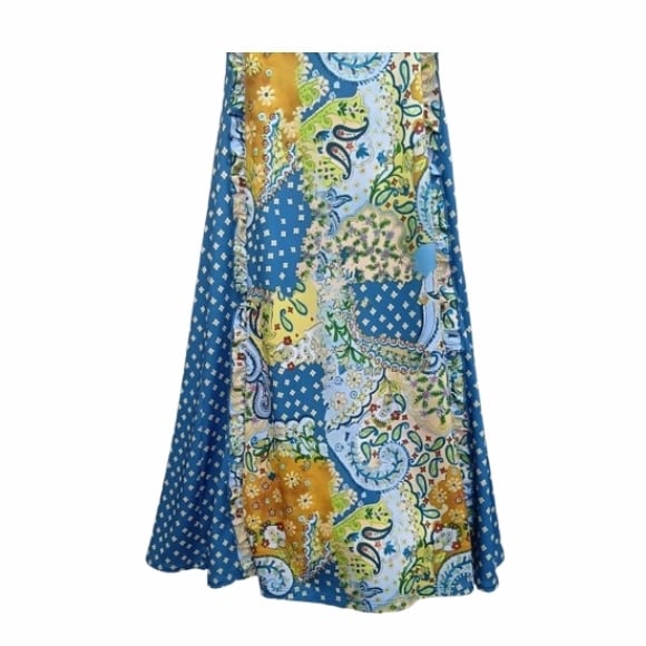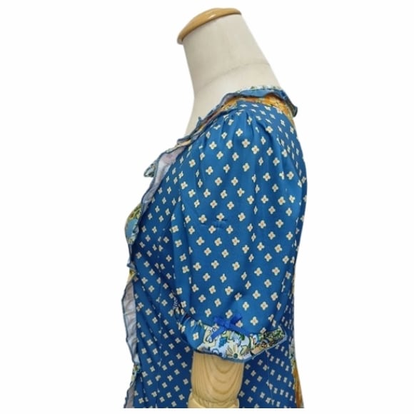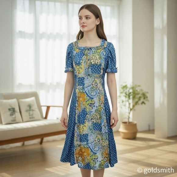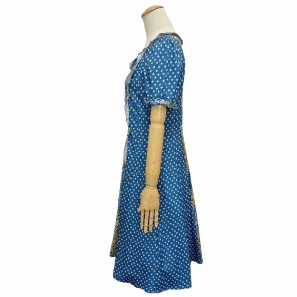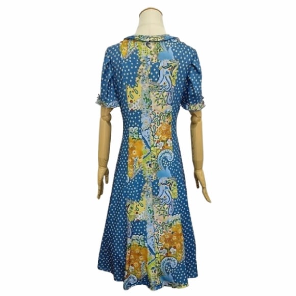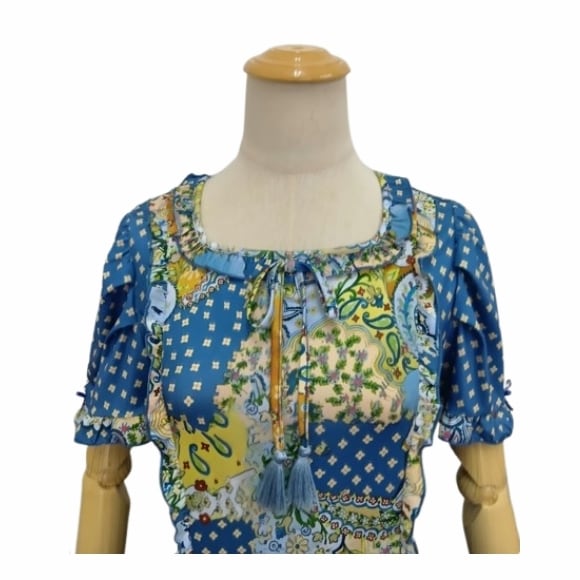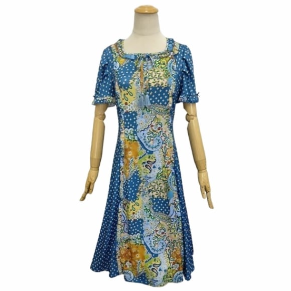 スーパービューティー ワンピース スクエアネック プリント切替 2516037 ブルー 2025年春夏 オーラボー Super Beauty レディース 半袖 リボン Aライン きれいめ 上品 ミセス