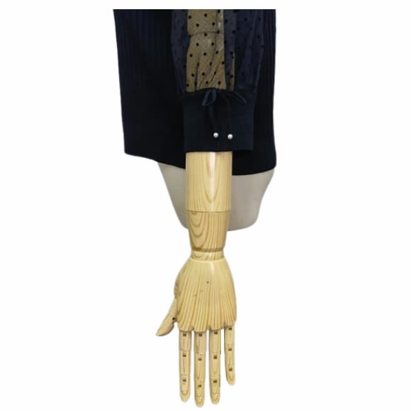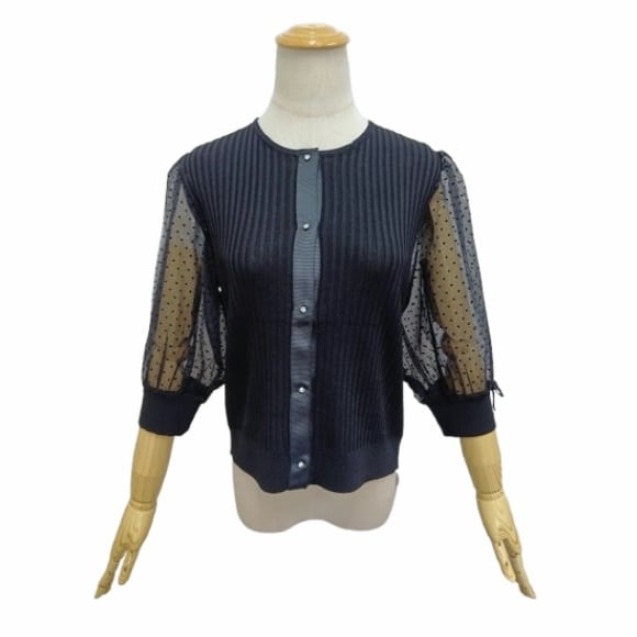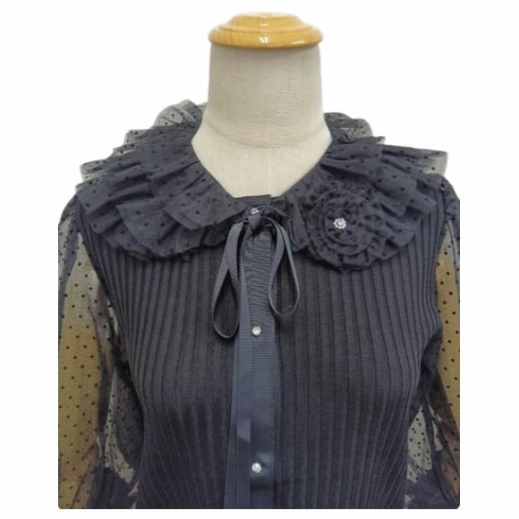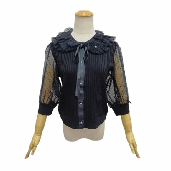 スーパービューティー リブ編み ニットカーディガン チュールドット袖 7分袖 付け襟 ブローチ付き 2611010 大人上品 きれいめ ミセス ブラック 2026年春夏 オーラボー Super Beauty レディース