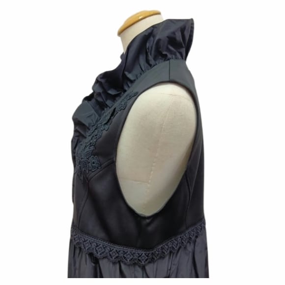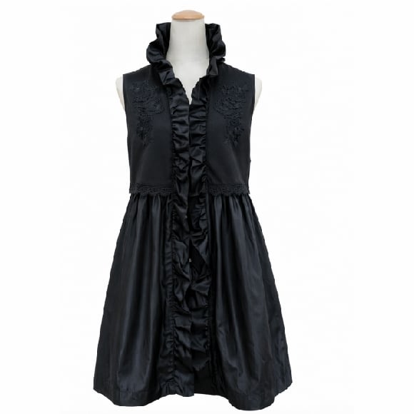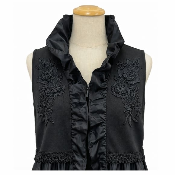 スーパービューティー ロングジレ 刺繍デザイン 異素材切替 タフタ フリルベスト ロングベスト 2617008 大人上品 きれいめ ミセス ブラック 2026年春夏 オーラボー Super Beauty レディース ミセス 大人可愛い