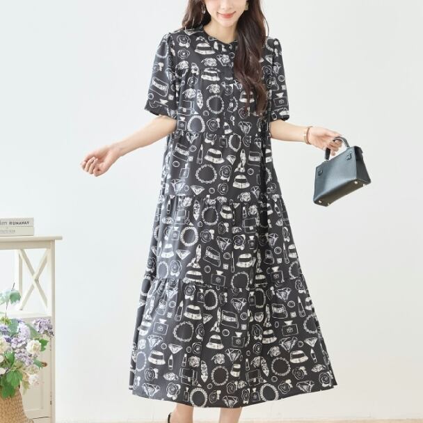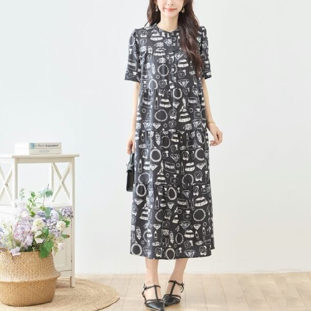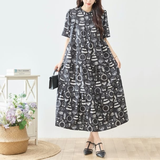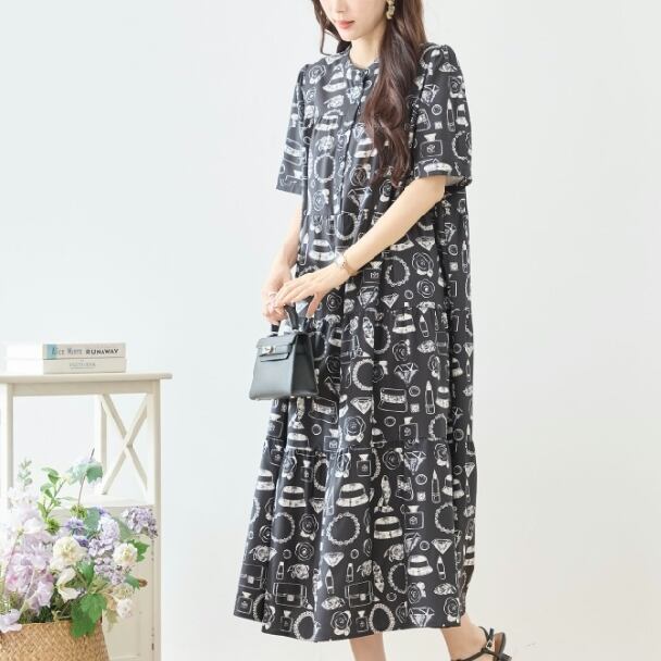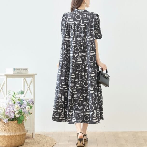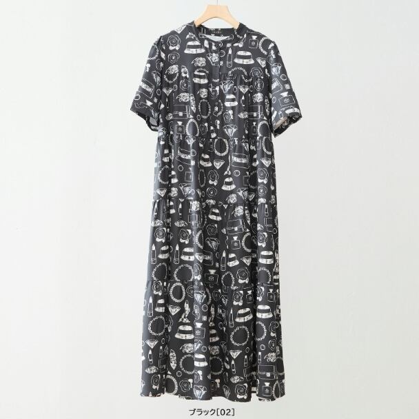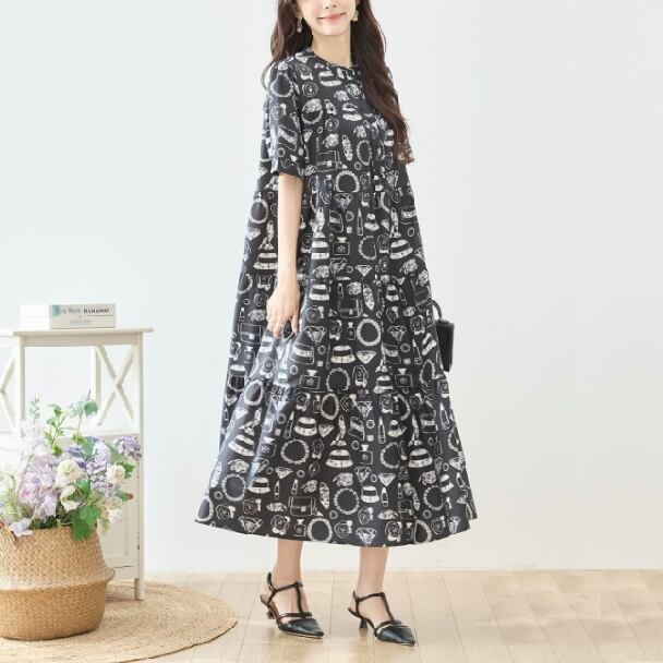 ティアードロングワンピース レディース 半袖 総柄 口紅 バッグ 帽子 フレア ゆったり きれいめ 大人可愛い 春夏 N83-295 TRUBE L LL エレガント fmsd レディース 半袖 大人フェミニン 大人可愛い