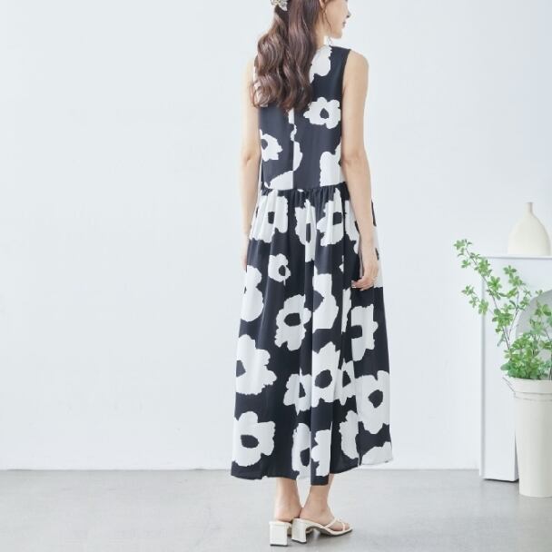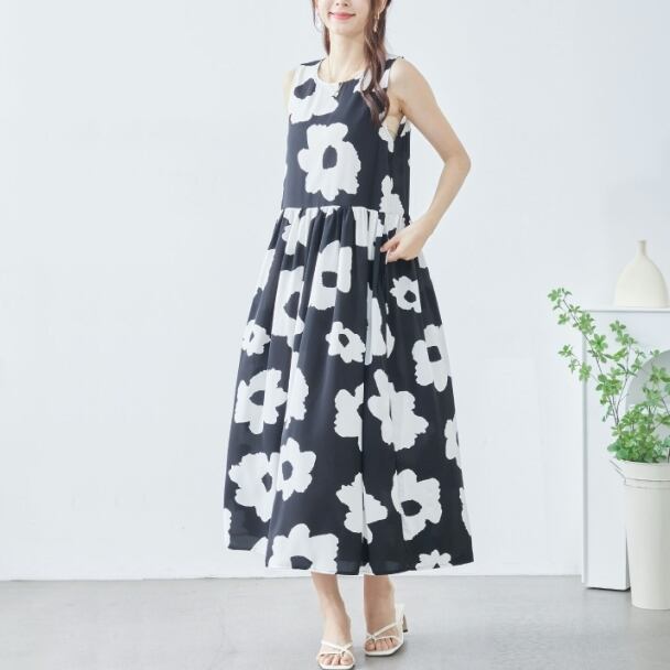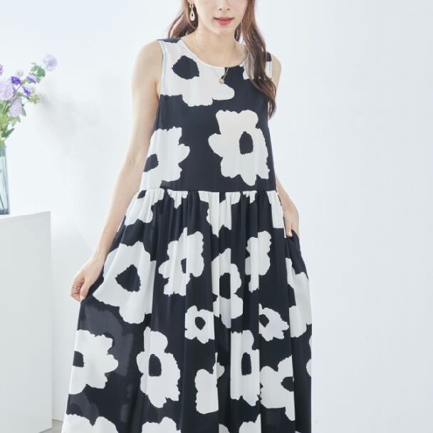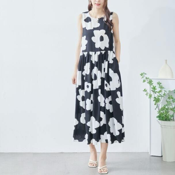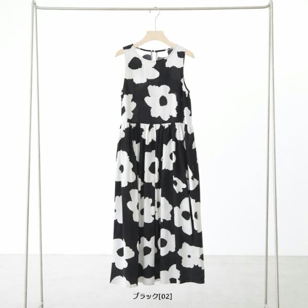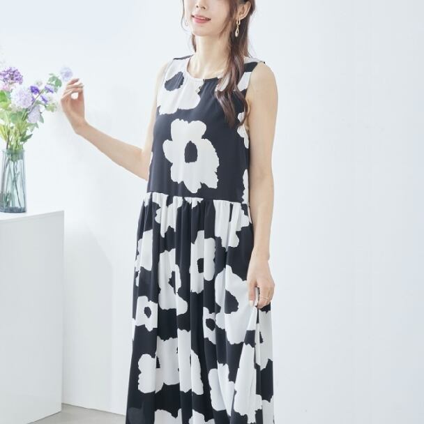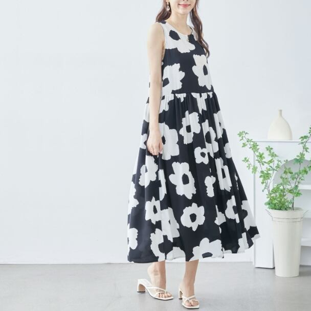 ノースリーブワンピース イラストフラワー柄 ティヤード C38-828 reve bleu M L ブラック ティアード ロングワンピース 花柄 フレア ゆったり きれいめ fmsd レディース ミセスキレイメ