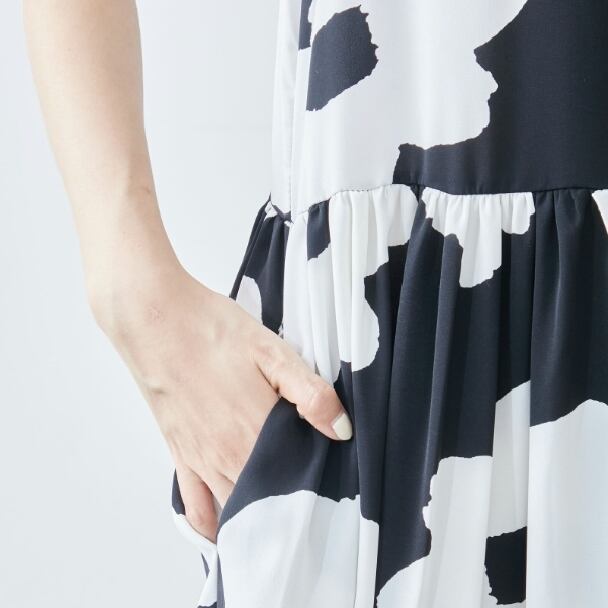 ウエスト切替から広がるティアードデザインは、