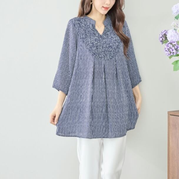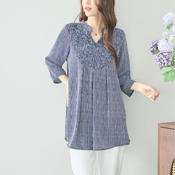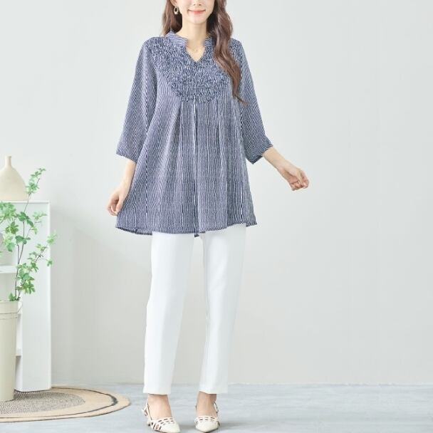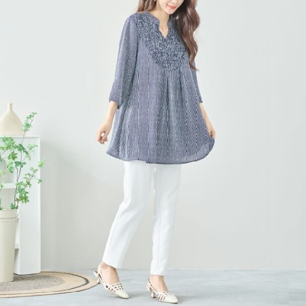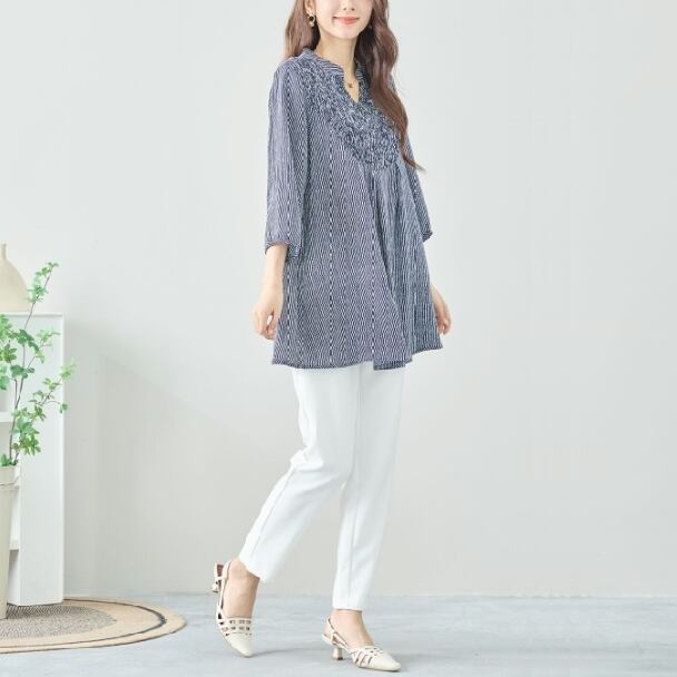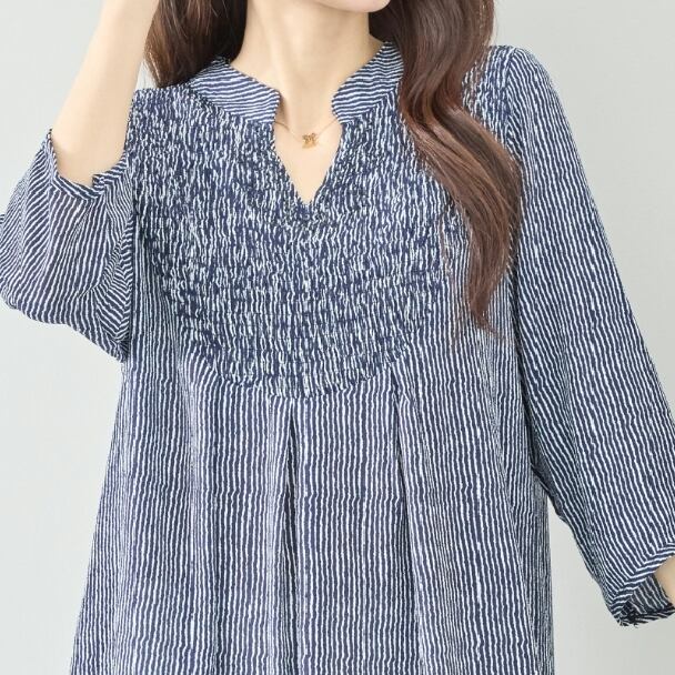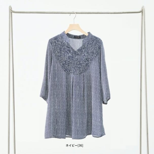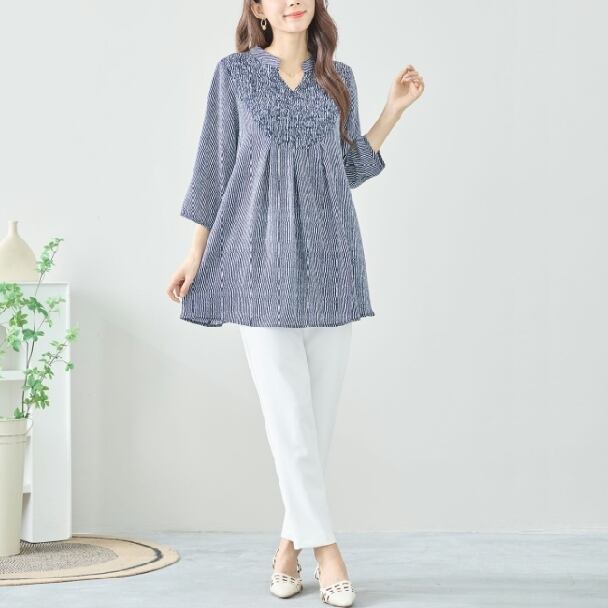 チュニック ラインストーン付き シャーリング ストライプブラウス C31-683 ネイビー TRUBE ミセスL LL fmsd フレア ゆったり きれいめ 上品 ミセス 春夏 おしゃれ 体型カバー
