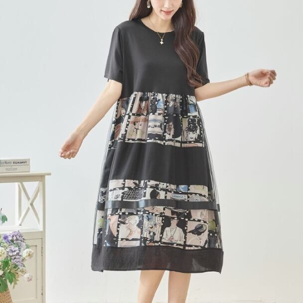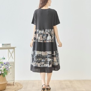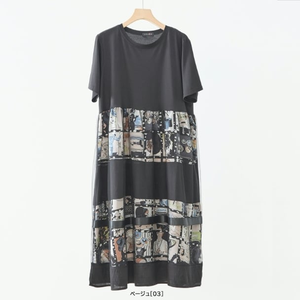 ワンピース フォトプリント 切替 シネマ風 コラージュ レイヤード風 N82-606 ベージュ TRUBE ミセスM L fmsd フレア ゆったり きれいめ 半袖 上品 ミセス 春夏 おしゃれ 体型カバー