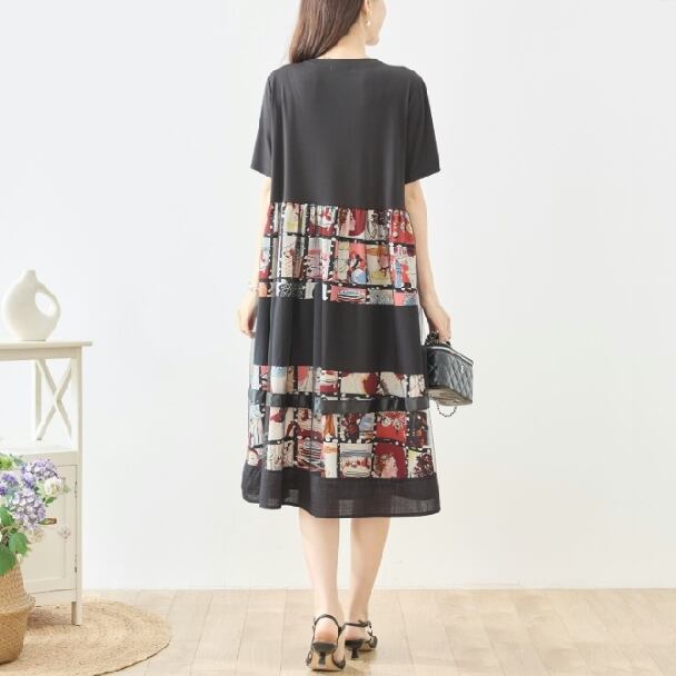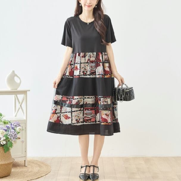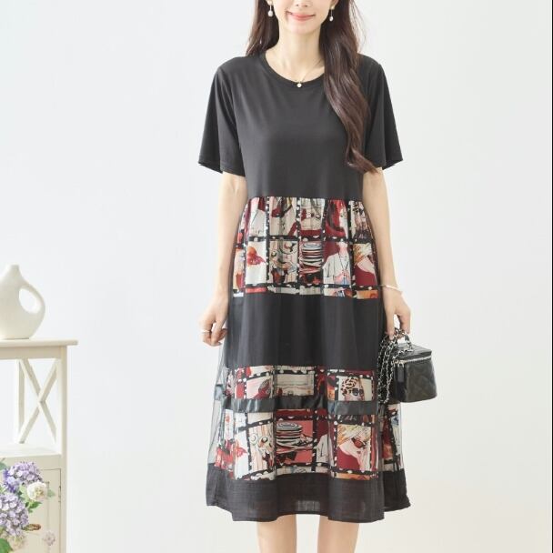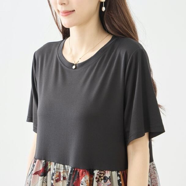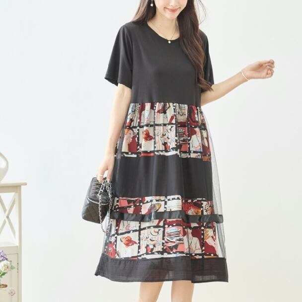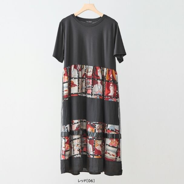 ワンピース フォトプリント 切替 シネマ風 コラージュ レイヤード風 N82-606 レッド TRUBE ミセスM L fmsd フレア ゆったり きれいめ 半袖 上品 ミセス 春夏 おしゃれ 体型カバー