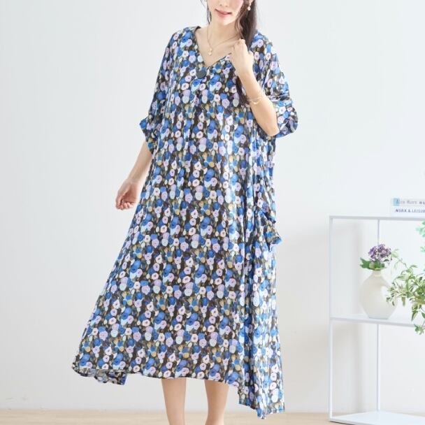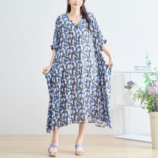 ティアードワンピース ボタニカルアート 1つボタン N82-273 ブルー TRUBE ミセス L LL fmsd フレア ゆったり きれいめ 半袖 上品 ミセス 春夏 おしゃれ 体型カバー