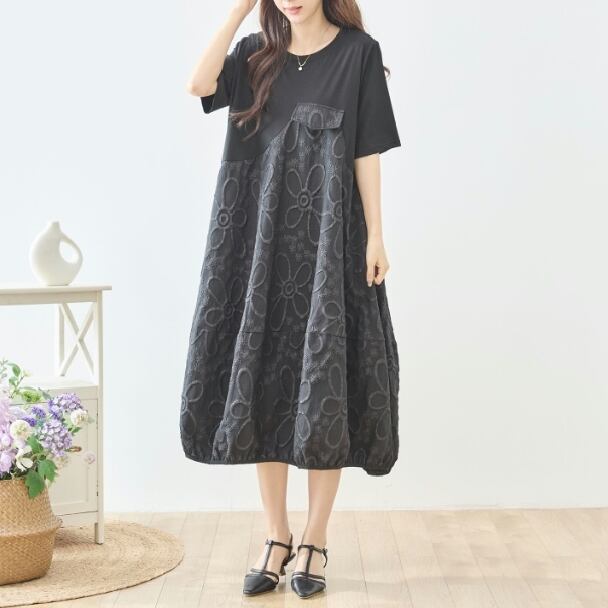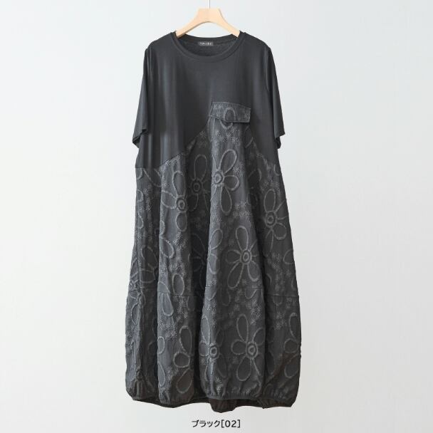 ワンピース バルーン サークル刺繍 切替デザイン N83-323 ブラック TRUBE ミセス M L fmsd フレア ゆったり きれいめ 半袖 上品 ミセス 春夏 おしゃれ 体型カバー