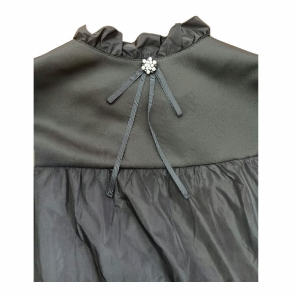 後ろ身頃は軽やかなタフタ素材で切替え、