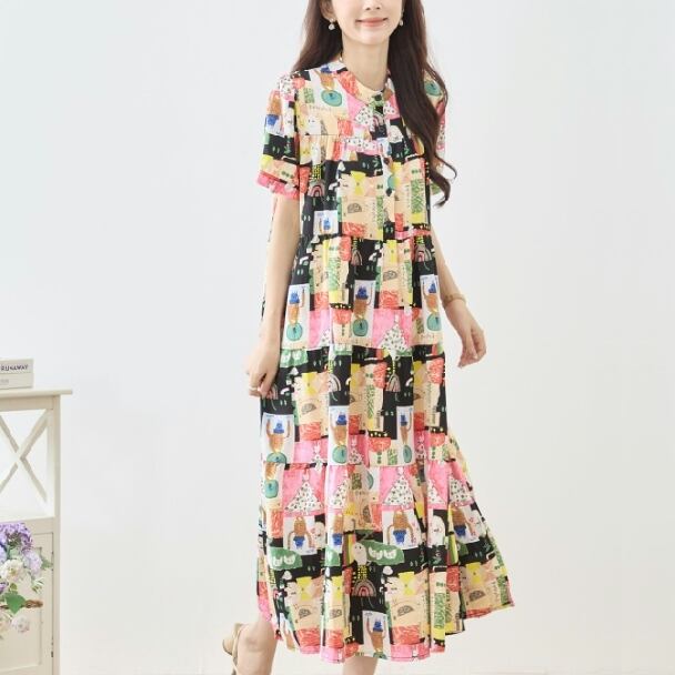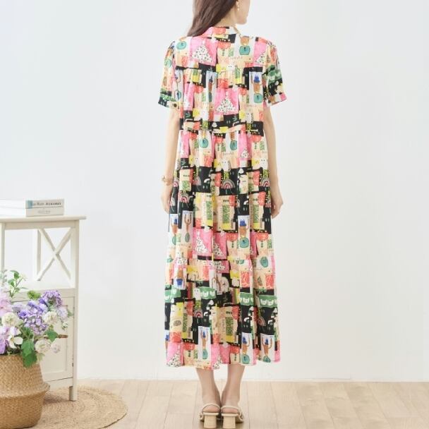 マキシワンピース フォークアート 総柄 ティアード N82-623 ブラック TRUBE ミセス L LL fmsd ゆったり 体型カバー 大人カジュアル きれいめ 半袖 上品 ミセス 春夏