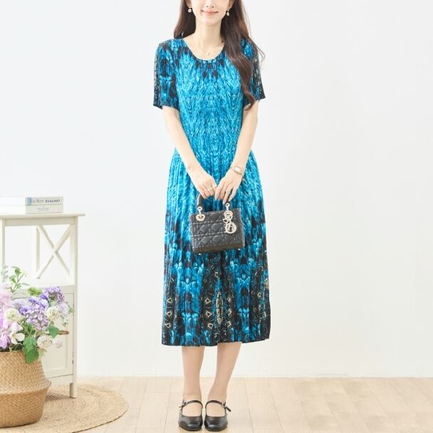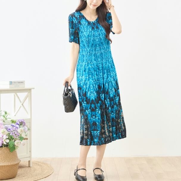 プリーツワンピース ピーコック 幾何学柄 N82-627 ブルー TRUBE ミセス M L fmsd ゆったり 体型カバー 大人カジュアル きれいめ 半袖 上品 ミセス 春夏