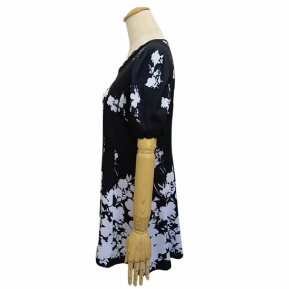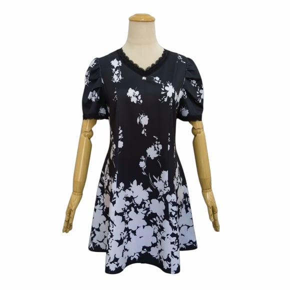 スーパービューティー チュニックTシャツ モノトーン柄 Vネック レース使い 2512041 ブラック 2025年春夏 オーラボー Super Beauty レディース 半袖 リボン きれいめ 上品 ミセス