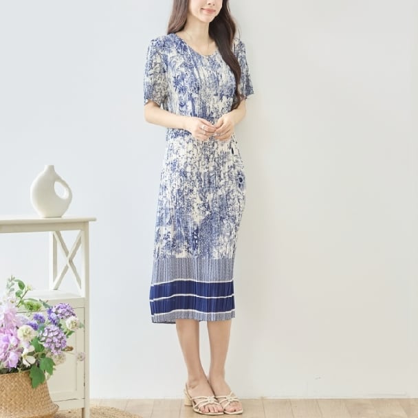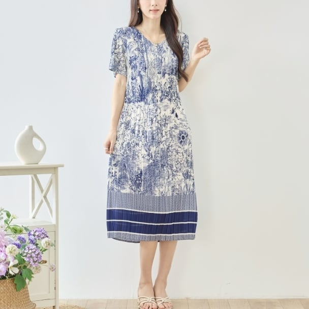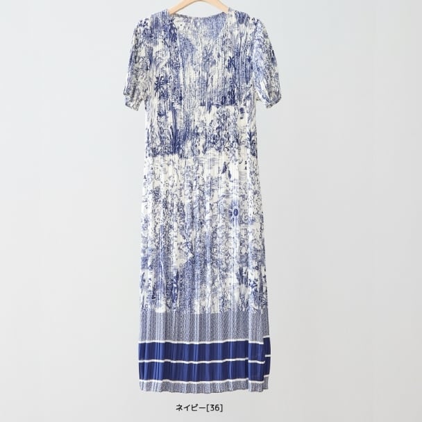 プリーツワンピース トワルドジュイ風 ボタニカル 細プリーツ マキシ丈 半袖 N82-630 ネイビー TRUBE ミセス M L fmsd ゆったり 体型カバー 大人カジュアル きれいめ 半袖 上品 ミセス 春夏