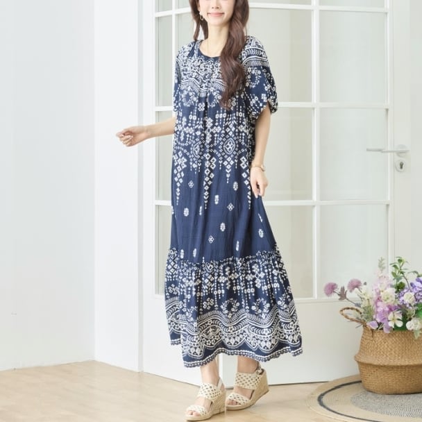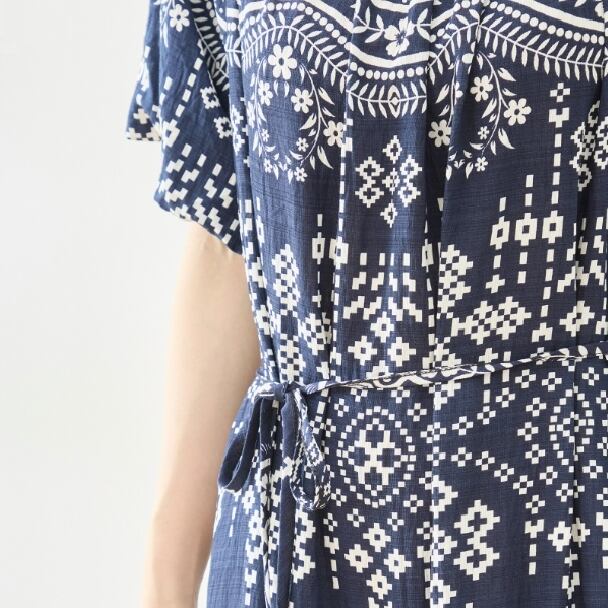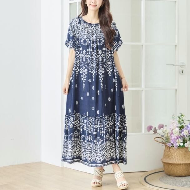 ティアードワンピース 総柄 ロングワンピース ウエスト紐ベルト付き 半袖 フレア N82-683 ネイビー TRUBE ミセス M L 体型カバー fmsd ゆったり 上品 ミセス 春夏 エレガント リゾート