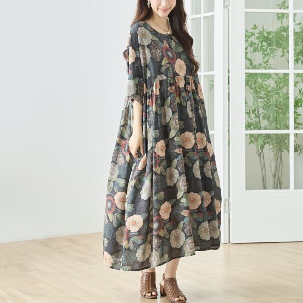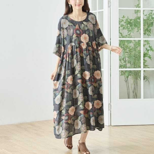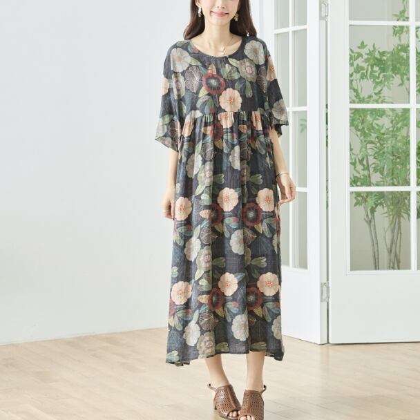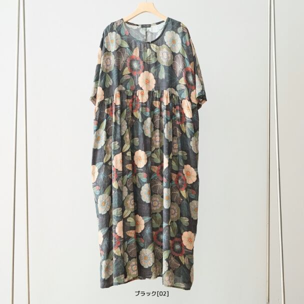 ワンピース コットン ロング 半袖 花柄 ナチュラル 綿100% N82-672 ブラック TRUBE ミセス L LL 体型カバー fmsd ゆったり 上品 ミセス 春夏 エレガント リゾート