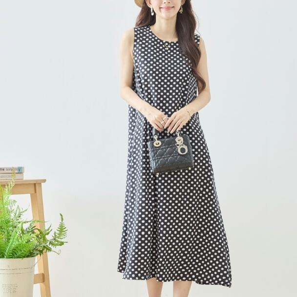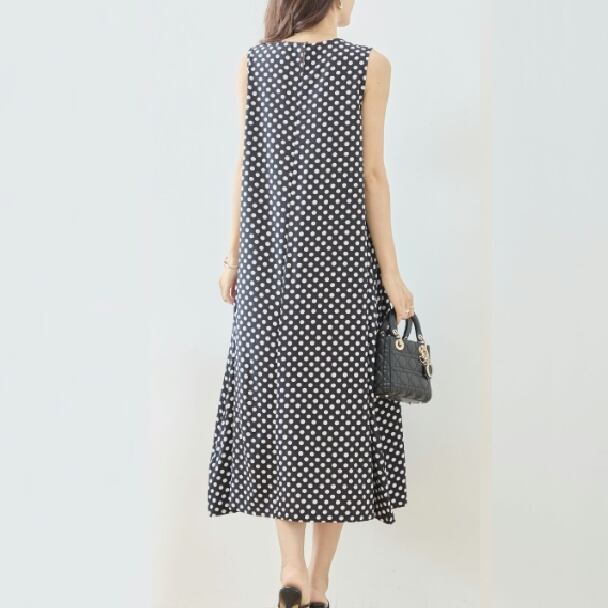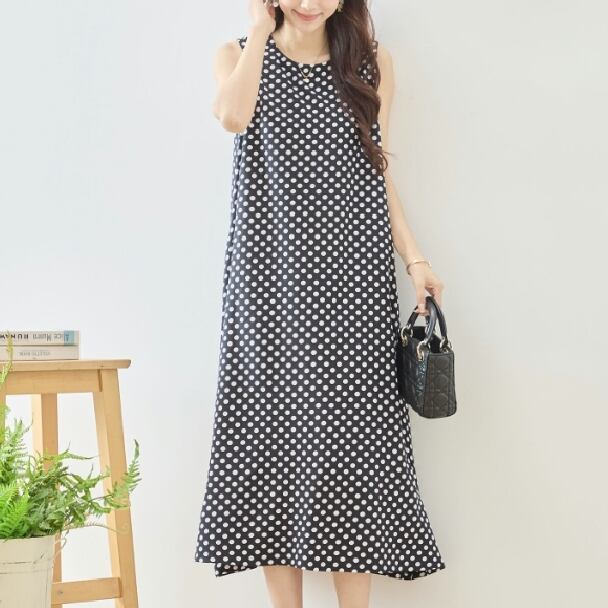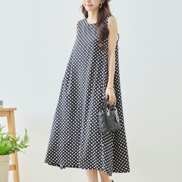 ワンピース ノースリーブ ドットマキシ丈 水玉 N83-338 ブラック TRUBE ロング フレア きれいめ ミセス M L 体型カバー fmsd ゆったり 上品 ミセス 春夏 エレガント リゾート