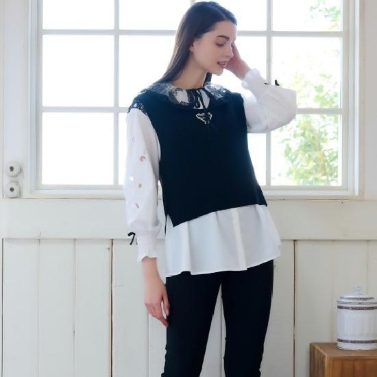 スーパービューティー Super Beauty アンサンブル ニットベスト×レース襟ブラウス ホワイト L LL 42 44 大人かわいい服 2215003