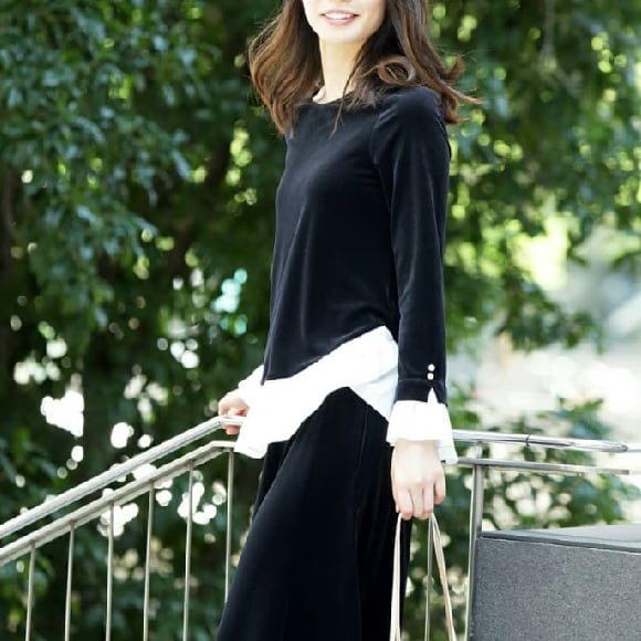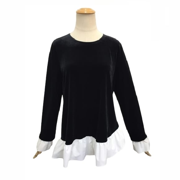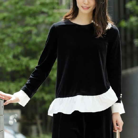 【Pont Neuf ポンヌフ 新品】ストレッチベロアトップス異素材使いドッキングプルオーバー ブラックM L 新品 BA3001 働く女子 通勤コーデ 大人可愛いコーディネート