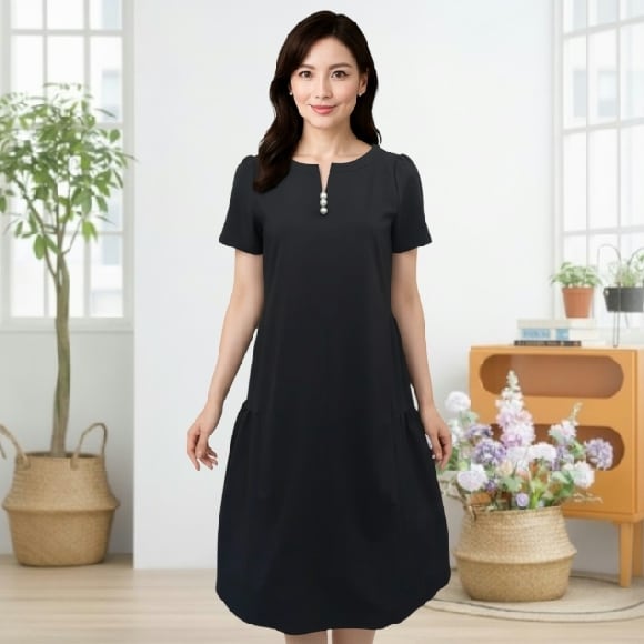 【トワレ toilette 新品】パール付き ティアード半袖 ワンピース ブラック M L 大人かわいい服 ディリーウェアー 323-153