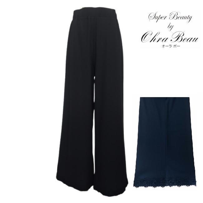 スーパービューティー ワイドパンツ 春夏 Super Beauty 裾レース使いハイテンション ブラック M L LL 大人かわいい服 2214011