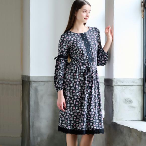 スーパービューティー ワンピース ピンク小花プリント オーラボー レース使いワンピー M L LL 2022年秋冬 大人かわいい服 2226005